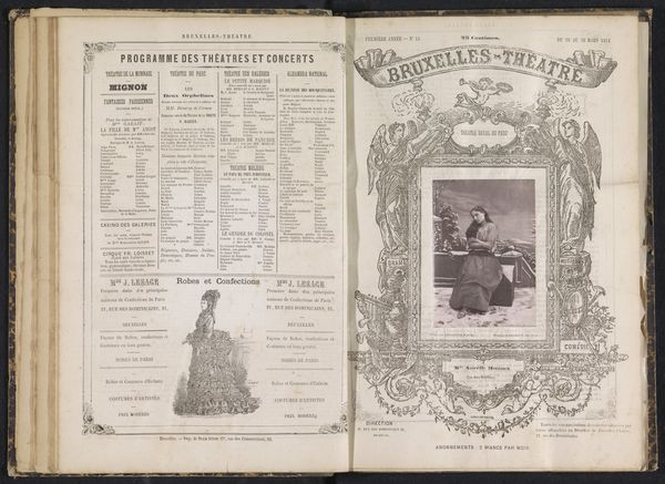 This is a photographic portrait of Benoît-Constant Coquelin, created by Ghémar Frères. It appears to be an albumen print, a process popular in the 19th century. The albumen process involved coating paper with egg white and then sensitizing it with silver nitrate. This created a smooth surface ideal for capturing fine details. Notice how this technique renders Coquelin’s features with remarkable clarity, emphasizing his gaze and the texture of his clothing. The tonal range, from deep shadows to bright highlights, speaks to the photographer's mastery of the chemistry involved. What’s interesting is the way the photograph is embedded into the printed page. The image of Coquelin becomes integrated into a broader media landscape: the page itself is filled with printed advertisements. It seems to be a page taken from a magazine, advertising the Brussels theater. This juxtaposition reminds us that photography was not just about artistic expression, but also about commerce and the construction of celebrity. It challenges our usual distinction between fine art and mass media.