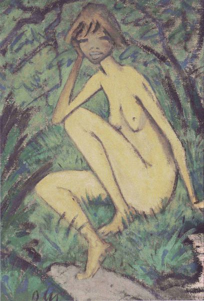 Editor: We are looking at Otto Mueller’s "Akt Im Wald," or "Nude in the Woods," created in 1923 using ink and watercolor. It's a deceptively simple composition, a solitary nude figure within a vaguely defined forest. The mood strikes me as pensive, maybe even melancholic. What's your initial read of this piece? Curator: It is striking how Mueller situates the figure not in a romanticized, classical Arcadia, but within a rawer, more psychologically charged landscape reminiscent of German Expressionism. Considering the social climate of post-World War I Germany, this portrayal carries significant weight. Editor: How so? Curator: Expressionism sought to portray the world through a subjective lens, often reflecting inner turmoil. Mueller, along with other artists of his time, challenged traditional academic notions of beauty and the idealized human form. In placing the nude within the forest, he removes the pretense of the classical and instead roots her in something altogether more disquieting. Note the almost harsh lines defining the trees, and the overall flattening of the picture plane, pushing against traditional perspective. Do you see that tension? Editor: I do. It's almost as if the figure is trapped, or perhaps deliberately hiding, within the woods. Is that sense of unease intentional, then? Curator: Intentionality is a difficult thing to prove definitively. However, given the historical context – the disillusionment following the war, the social and political instability – the artistic choices of angularity and starkness resonate with that broader sense of anxiety. What do you think this artwork suggests about the public role of art during this period? Editor: I hadn’t thought about it that way before. It shows the artist's critical reflection on humanity. Thanks, I now appreciate it so much more as a representation of this period! Curator: Absolutely! Thinking about the art as both a cultural artifact and reflection can certainly deepen one's understanding.
