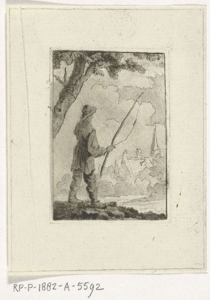 Curator: This is a fascinating print titled "Jongen met een vlindernet steekt een vlinder op zijn hoed," which translates to "Boy with a Butterfly Net Sticking a Butterfly on His Hat." It's an etching on paper from the period between 1849 and 1909, currently held in the Rijksmuseum collection. The artist is Lionel Oscar Baes. Editor: It’s a striking image. The monochromatic etching emphasizes a somber mood; the figure is hunched, absorbed by his actions against a landscape rendered in delicate tonal gradations. Curator: It really draws you in, doesn't it? As a genre painting, the scene reflects the times, tapping into broader anxieties of the late 19th century regarding nature, childhood, and innocence. The capture of butterflies as a scientific, hobbyist practice mirrors contemporary power dynamics, specifically mankind's dominion over the natural world. This echoes the impact of colonial expansion, exploitation, and industrial growth of the time. Editor: The interplay between figure and landscape seems quite intentional. Notice how the curve of the hill behind the boy is subtly echoed in the slope of his shoulders, creating a sense of being grounded within his surroundings, while he's actively extracting and preserving part of it. Semiotically, you can read his hat and the act of pinning as claiming and classification, ordering nature to reflect a certain vision. Curator: Absolutely. And perhaps it reflects societal pressures of the era to catalogue, collect, control. Even something as seemingly innocent as butterfly collecting became symptomatic of broader social structures that valued accumulation and power over nature. The act of impaling the butterfly can be read as a loss of freedom or agency within society. Editor: It’s a clever paradox. There is the boy’s evident focus and delicate precision, carefully captured by the etching. The eye is guided, via the angling light on his cap, to the dark butterfly awaiting the pinprick of "capture," contrasted with a far less precise or clear execution of the foliage background. A certain tension arises, wouldn’t you say? Curator: The choice of the artist to depict such a commonplace activity lends to its realism. But there's this haunting sense, particularly with our understanding of environmentalism today, that underscores our role in a larger, perhaps destructive cycle of subjugating natural life. It urges a reconsideration of innocence, industrial impact, and our ever-evolving relationship with the environment. Editor: A haunting visual indeed. A superb etching in how it elicits a multilayered, structural, emotional, and ecological unease from a deceptively "simple" portrait, as is typical with semiotic structures that expose underlying, sometimes disturbing assumptions. Curator: Well said. It demonstrates how even seemingly benign activities can carry complex and sometimes unsettling social, historical, and personal implications. Thank you for offering a new lens to appreciate Baes’s approach.