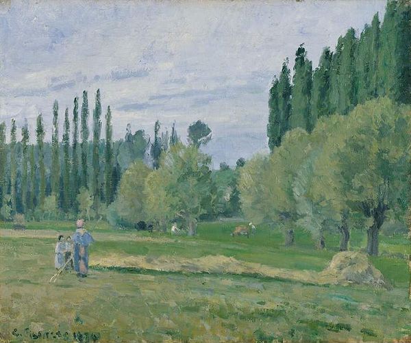 Camille Pissarro painted 'Haymaking at Éragny' using oil on canvas to depict rural life in late 19th-century France. Pissarro, deeply engaged with anarchist ideals, often chose subjects that highlighted the dignity of labor and the beauty of the everyday. Here, he captures peasants working in the fields of Éragny, a small village where he lived. The scene isn't just a picturesque view; it’s a reflection on the value of work and the connection to the land. The laborers, rendered with respect, embody the physical and social realities of rural life. Though Pissarro was not a peasant himself, he felt connected to the people and the land through shared labor and the simple life. His work promotes the idea of a society rooted in equality and mutual respect, challenging the traditional hierarchies of the art world. The painting quietly celebrates the unsung labor that sustains society, inviting us to reflect on our relationship to the natural world and to one another.