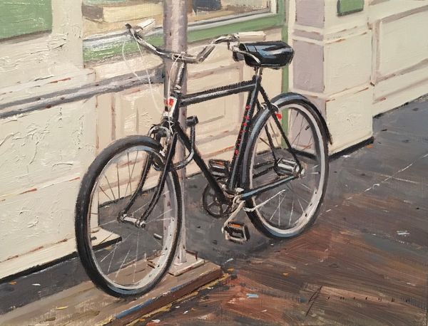 Editor: Right now, we're looking at "The English Way" by Jeff Jamison. It's an oil painting, a modern cityscape. It evokes such a quiet, almost melancholy mood... What do you see when you look at it? Curator: Well, I feel drawn into a drizzly afternoon. I love how Jamison captures that very specific light of a city after a rain shower - almost opalescent, reflecting everywhere. It's more than just a record of a street; it’s an emotional space. Look how the figures are slightly blurred; do they feel lonely or simply like components of an urban choreography? Editor: Urban choreography... I like that. The umbrellas certainly add to it. But the architecture seems so...stark, almost imposing. Curator: It does, doesn’t it? Those pale facades loom, but the wet streets and those crimson umbrellas soften the scene, giving a feeling of fleeting moments of connection within an environment that’s perhaps traditionally been seen as cold and hard edged. Do you think Jamison is suggesting we reconsider our relationship to these kinds of urban spaces? Editor: I hadn’t thought of it that way! It makes me consider the beauty in the everyday, even the dreary. I initially saw it as melancholy, but now there’s a sense of warmth. Curator: Exactly! And isn't that the joy of art? It transforms our perceptions, offers new angles. "The English Way" offers a reflective moment amid the rush, doesn't it?