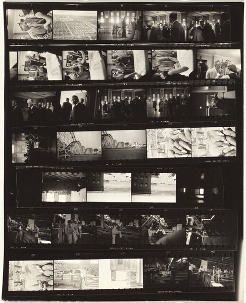 Robert Frank made this gelatin silver print, *Hollywood 9*, sometime in the 20th century. What you see here are frames from a roll of film, a sequence of shots that give you a sense of time passing and decisions being made. There's a red 'X' through one of the frames, a brutal mark. It makes me think about how artists pick and choose, edit, and sometimes reject their own work. In each frame, the figures appear against what seems like a brightly lit room. The tonal range is quite limited, with stark contrasts. It’s as if Frank is pushing the medium to its limits, embracing the raw, almost gritty quality of the film. The dark silhouette of a figure in the marked frame is really striking. The figure seems to be looking out or away. The surrounding border emphasizes the moment and the act of looking. Looking to see and know, but never fully understanding. Like a conversation, the film strip invites us to piece things together, to make connections, to find meaning in the fragmented moments. It reminds me a little of Gerhard Richter's photo paintings, where blur and focus both reveal and conceal. It's this tension, this push and pull, that makes the work so compelling.
