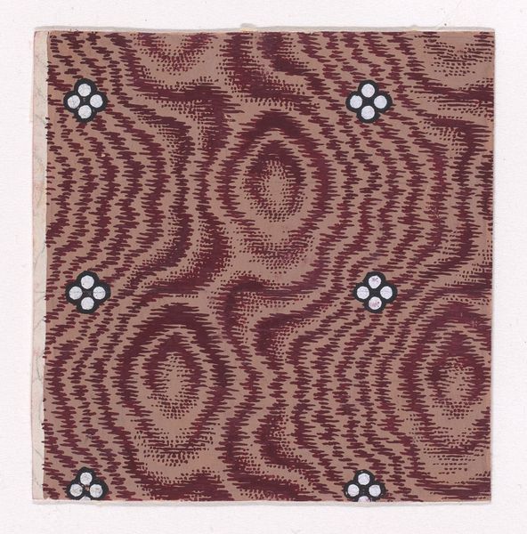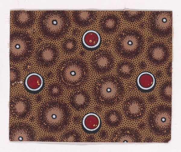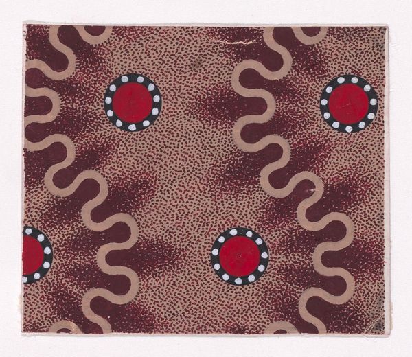 This textile design, made by an anonymous artist, presents a fascinating interplay of pattern and texture on a small scale. The work is dominated by a vermicular ribbon that meanders across an abstract honeycomb ground, dotted with splattered pearls. The composition relies on a rhythmic repetition of shapes. Note how the meandering ribbon, with its saw-toothed edge, creates a dynamic contrast against the static honeycomb pattern. The artist has disrupted any sense of fixity through the scattering of pearl-like dots, which undermines the rigidity of the underlying grid. The restricted palette of earthy reds, browns, and whites enhances the textural feel, emphasizing the materiality of the design. The use of simple geometric forms and the emphasis on surface texture can be seen as a move away from traditional representational art. This design invites us to reconsider our perception of order and chaos, regularity and randomness.