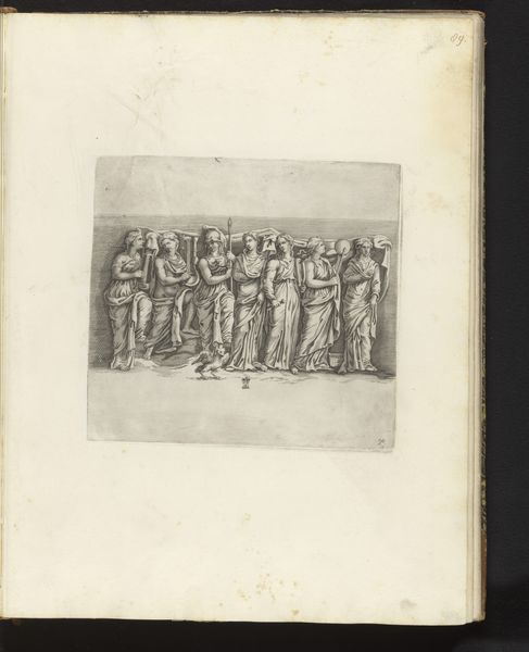 Curator: This engraving is William Blake's "Job and His Family," created in 1825. What are your first impressions? Editor: Well, it feels both very formal and intimate. Everyone's arranged so symmetrically, but there's a real tenderness in their gestures. It’s like a family portrait but also a grand, almost theatrical scene. What do you see in this piece, beyond the immediate family dynamic? Curator: Beyond the family tableau, consider the socio-political context of the Romantic era. Blake, often a critic of institutional power, uses the figure of Job to explore themes of suffering, faith, and ultimately, redemption. Notice the landscape—the contrast between the idyllic setting and the presence of trials, symbolized by the prostrate figures and the torment he endured. Editor: So, it’s less about simple piety and more about the struggle against systemic injustice? Curator: Precisely! Blake uses the visual language of the Bible to critique the very structures that often use that same language to justify oppression. Look at the serpent entwined around the tree, topped by a patriarchal figure. What does that symbolise to you? Editor: Authority... almost like an old-fashioned representation of power but rooted in something ancient and… potentially deceptive. So Blake is taking the biblical story and turning it into a commentary on power structures? Curator: Exactly. It invites us to question whose voices are heard, whose suffering is validated, and how narratives of faith are manipulated for political gain. The personal suffering of Job mirrors the broader injustices prevalent in Blake’s society and beyond. Editor: It's incredible how much social commentary he packed into one image. I came in thinking it was a simple depiction of a Bible story, and now I see so much more about power and justice. Curator: Indeed, it underscores the power of art to spark dialogue and challenge prevailing norms, inviting us to reflect on the continuous struggle for liberation and social change.