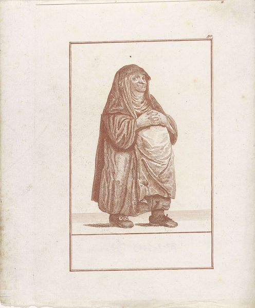 Curator: Jacob Gole’s engraving, from around 1724, is titled “Dikke monnik met de sleutels van hemel en aarde,” or, in English, "Fat Monk with the keys of Heaven and Earth." It resides here at the Rijksmuseum. Editor: Oh my! The instant vibe is… slightly unsettling, almost darkly humorous? I'm struck by the figure, weighed down – almost literally shackled – by those enormous keys! There's an almost absurd quality to the composition. Curator: Absolutely. The engraving's success is partly due to its clever material presentation. We can see the etched lines create tone and texture, essential to conveying a sense of the monk’s substantial weight, both physical and symbolic. Editor: Symbolism being? Those keys seem less about opening doors and more about representing burden of religious authority, and isn't that a scapular around his neck? He’s like a caricature of earthly and heavenly power, struggling under the expectations! The lines around his face… each wrinkle feels like a year of hard-won but compromised… wisdom. Curator: Well observed. Baroque prints like these often played with popular archetypes. Gole capitalizes on a rising interest in satirical portraits which allowed for public questioning of status, but more interestingly, increased engraving production. Editor: It feels deeply human, but not in a sentimental way. The cross-hatching of lines almost looks like… layers of earthly troubles mapped on skin! It's a masterclass in subtle rebellion conveyed through skillful manipulation of the material—the ink and plate. How radical for the time. Curator: Gole's use of line in this engraving really does prompt us to reflect upon the processes of image-making itself and to consider prints not merely as copies, but as primary sites of aesthetic innovation, shaped by economic, and even socio-political forces. Editor: Right! Thanks to Jacob Gole's craft we aren't just looking, we're considering, feeling the weight. A brilliant and very human piece of work.