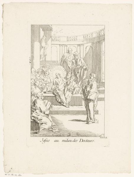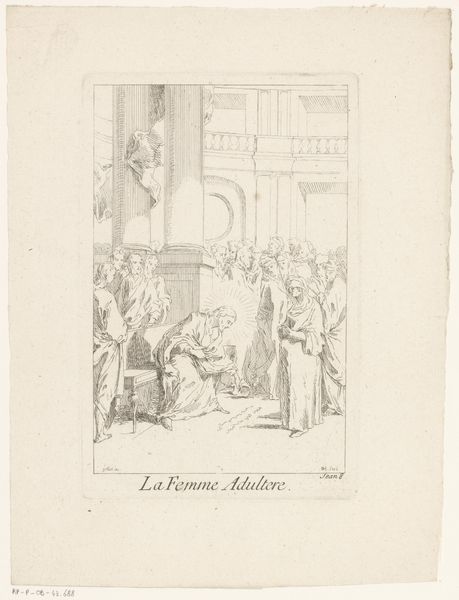 This print, made by Gabriel Huquier, shows a scene dominated by linear forms and delicate etching. The composition is structured around the contrast between the dark, densely lined foreground figures and the more open, sketch-like background architecture and sky. The overall effect is one of understated drama, where the tension is held within the lines themselves. Here, the arrangement of figures creates a semiotic interplay. Christ, positioned to the left, faces a procession of men. The gazes and gestures suggests a narrative of moral struggle. Huquier uses the architectural backdrop to frame the figures, adding depth while reinforcing the theme. The light etches contrast with the shadow, playing with depth and surface. Ultimately, this small print reflects broader philosophical concerns about wealth, morality, and representation. It invites us to reflect on how we construct meaning through composition, line, and the human form, and how these elements work together to create a powerful visual statement within a small frame.