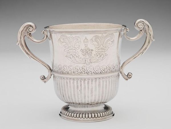 Editor: Here we have a two-handled cup, whose maker is only known by the monogram TC. The floral designs are quite beautiful. What can you tell me about this object's creation and use? Curator: It's fascinating to consider the silversmith's process. The marks suggest handcrafting, raising questions about labor, skill, and the social status associated with owning such a piece. Was it functional, ornamental, or both? Editor: Good point. I hadn’t thought about how the material itself signifies status. Curator: Precisely. The material speaks volumes about consumption. Silver's value positions this cup within a network of trade, wealth, and potentially, power. What does its existence tell us about the society that valued it? Editor: I see it now. Thinking about the cup's journey from raw material to finished product, and its place in society, really brings it to life.