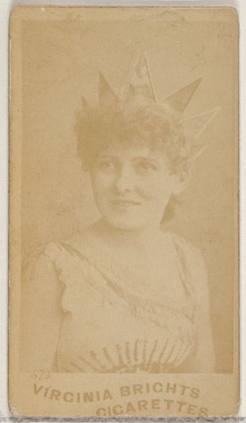 This small promotional card from the 'Actors and Actresses' series, by Allen & Ginter, features a sepia-toned portrait set against the backdrop advertising Virginia Brights Cigarettes. Its diminutive size belies its complexity, prompting an exploration into the interplay of surface and depth. The photograph's composition, with the actress gazing slightly off-center, disrupts the conventional frontal pose, inviting a sense of narrative possibility. The limited tonal range collapses the figure and ground, creating a flattened picture plane that anticipates modernist abstraction. The subject's features, softened by the photographic process, become secondary to the formal qualities of light and shadow. Considered through a semiotic lens, the card functions as both a commercial object and a cultural artifact. The actress, a signifier of beauty and allure, is strategically positioned to elevate the Virginia Brights brand. This collapsing of art and commerce challenges traditional aesthetic categories, inviting contemplation on the commodification of image and identity. The card destabilizes fixed notions, existing as an ongoing interpretation of cultural and philosophical discourse.
