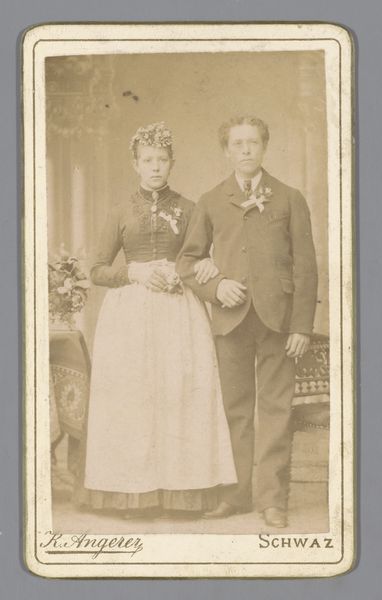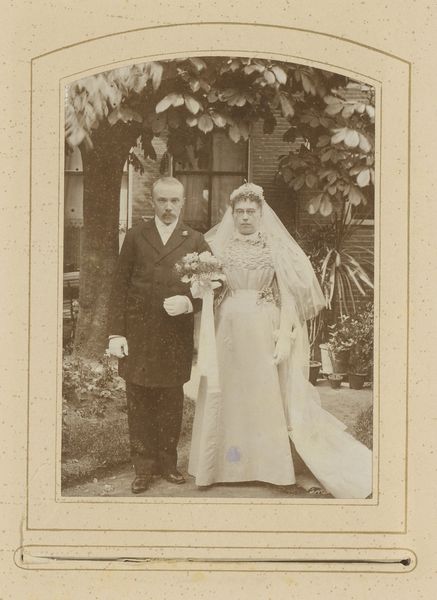 Editor: This is "Portret van een onbekend echtpaar in trouwkleding," or Portrait of an Unknown Married Couple in Wedding Clothing. It's a photograph, dating from around 1910 to 1925. What strikes me is how posed and formal they seem. What can you tell us about its cultural context? Curator: It's interesting to consider how studio photography like this reflects social expectations and aspirations. During this period, photography became more accessible to the middle class. A wedding portrait wasn't just a memento; it was a public declaration of status and respectability, a way to participate in modern visual culture. Editor: So, it’s less about capturing candid joy and more about societal performance? Curator: Precisely. Think about how the backdrop is carefully arranged, and the couple are posed rigidly to convey an image of permanence and stability. They aren't smiling. The museum itself plays a vital role here, because displaying it impacts our understanding today, moving it away from a simple document of the past and transforming it into a tool of cultural preservation, raising the image to "art". Where do you think it might have been taken and hung at the time? Editor: I guess it would probably hang in their house, as a constant reminder for themselves, maybe in the living room. Maybe they would display it in their office to show respectability? That makes me think of how we display our own wedding photos now – often it’s the perfectly curated Instagram shot. Is this photograph, in a way, similar to today’s Instagram culture? Curator: Absolutely. There's a continuous thread of visual representation tied to identity, but mediated by available technologies and platforms. This photograph, like an Instagram post, participates in constructing and projecting an image of the self, albeit within its own specific historical framework. Editor: This has been a super helpful look into how this picture works as a product of culture! Thanks so much! Curator: My pleasure. It’s a good reminder of how even seemingly simple images carry significant social weight.