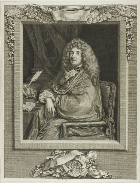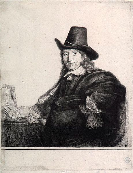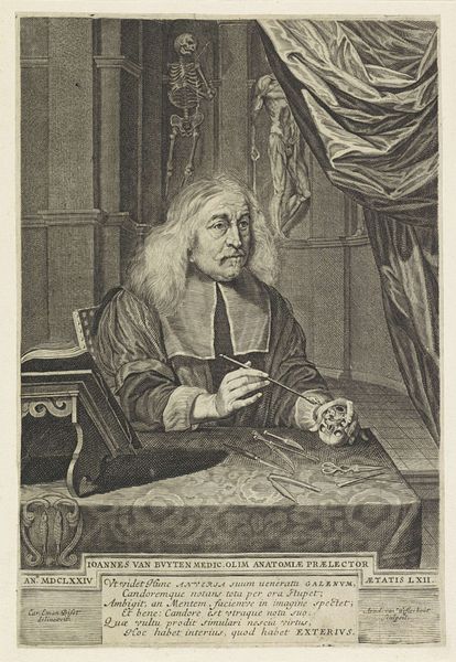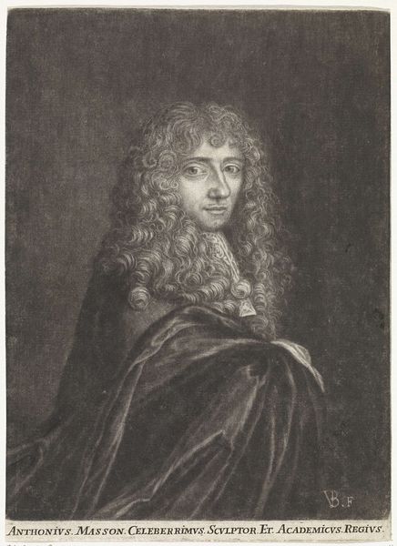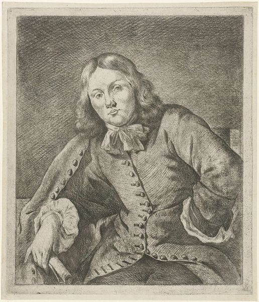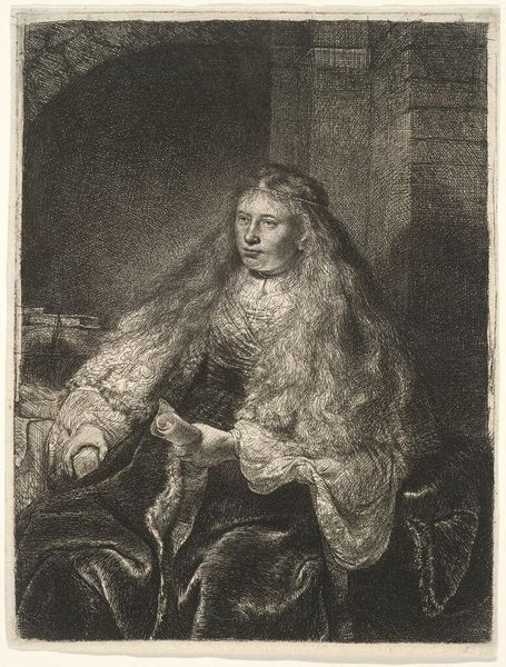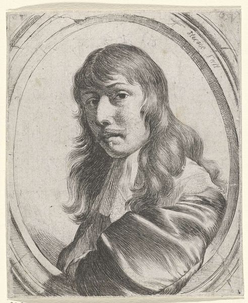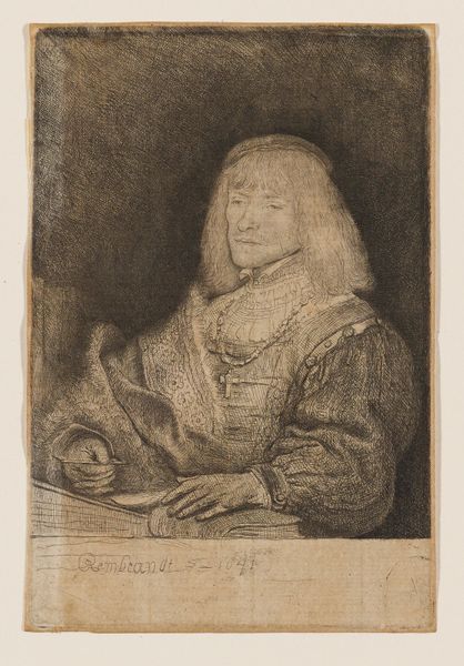 This is a small etching, measuring 9 by 7 centimeters, made by Rembrandt van Rijn. The close hatching is what gives the piece its rich blacks and velvety texture. Look closely at the subject: a man adorned with a crucifix. The rendering, with its textured lines, lends a profound sense of materiality. The artist utilizes chiaroscuro to focus attention on the man’s face, an island of light amidst the surrounding darkness. Rembrandt uses light not just to illuminate but to explore interiority. Consider how Rembrandt employs the graphic language of etching to destabilize conventional portraiture, inviting us to look beyond the surface. The interplay between light and shadow and the textural density raise questions about truth and illusion. The work doesn't present a fixed meaning but rather invites ongoing interpretation.