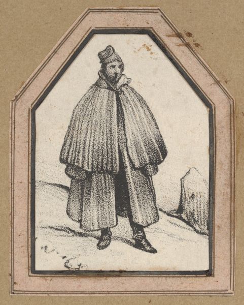 Curator: I find myself captivated by the image before us: a woodcut from 1576 by Melchior Lorck, titled "Standing soldier, seen from the front; in his right hand, a lance with a pennant on the tip; in his left hand, a club; on his head, a turban with two feathers; in the landscape, a "lighthouse" and a couple of obelisk-like buildings." Quite a mouthful, but descriptive! Editor: Immediately, I notice the stark contrast. The fine lines create this complex patterned robe and turban against a bare, almost desolate landscape. It projects a sense of isolation, despite the figure's bold stance. Curator: It's believed this is a portrayal of an Ottoman soldier. The imagery used certainly links it to the prevailing European understanding and representation of the "Orient". Notice the symbolic significance of the lighthouse—suggesting perhaps, a beacon, guiding or warning about this foreign power. Editor: And those obelisk-like buildings, seemingly ancient ruins, introduce a historical depth to the scene, don't they? Are they meant to evoke the glory or perhaps the decay of a civilization? The balance of light and shadow further emphasizes the soldier’s commanding presence. His gaze feels… unflinching. Curator: Absolutely. The turban with feathers, the lance, and the mace—these are all potent symbols of power and status within the Ottoman military. But I think there's also a deeper current here. Lorck, through his travels, was interested in authentic portrayals of different cultures. The soldier embodies both the "other" and a dignified warrior. The landscape in itself might also signify what the Orient symbolized back in the West—the unknown. Editor: I agree. The visual weight is so deliberately distributed. The linear precision conveys a strong sense of the subject's cultural weight. The landscape contributes a certain drama, almost like a stage setting, enhancing the symbolic value. Curator: And that's why this piece continues to resonate. It bridges historical representation with a formal artistic rendering, asking us to consider how cultures perceive and represent each other. Editor: Precisely. The artist uses a precise medium and balanced composition to spark a deeper contemplation beyond surface appearances. There's almost a silent power emanating from the piece.
