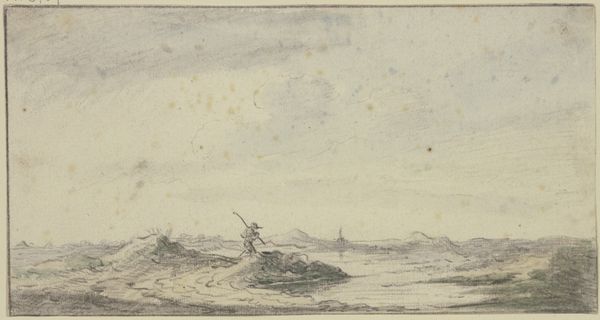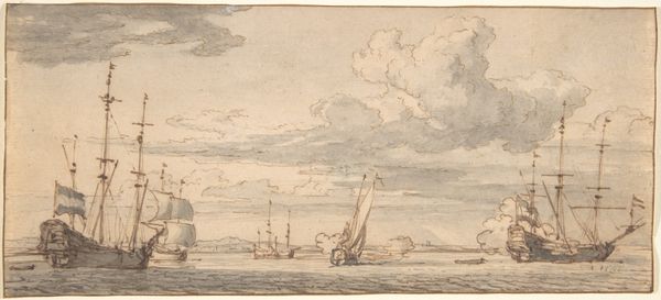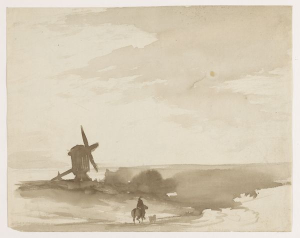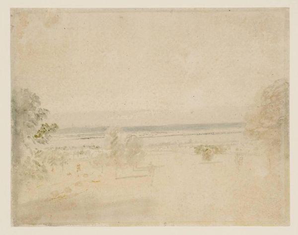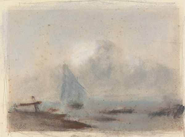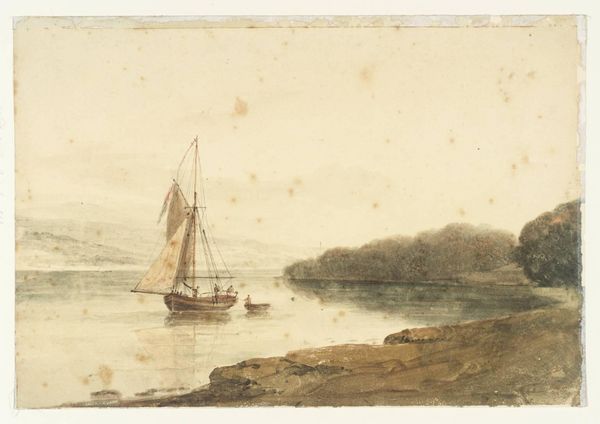 Editor: This is William Henry Hunt's watercolor, "Seascape," held at the Tate. It evokes a sense of calm, yet there's also a hint of melancholy. What do you see in this piece, especially regarding its symbolism? Curator: The ship carries potent symbolism. Consider the romantic era's fascination with the sublime. The vessel, a fragile human endeavor, set against the vastness of nature. Does it represent adventure, escape, or perhaps the transient nature of life? Editor: That's a powerful way to look at it! I hadn't considered the ship as representing humanity itself. Curator: Indeed. And the muted colors contribute. The beach signifies grounding, yet the sky hints at something beyond. A liminal space. Where is the ship going? Where have we been? Editor: Thank you, that really expands my understanding of the emotional depth within this seemingly simple seascape. Curator: Symbolism enriches our experience. It’s fascinating how a few brushstrokes can evoke such complex feelings.