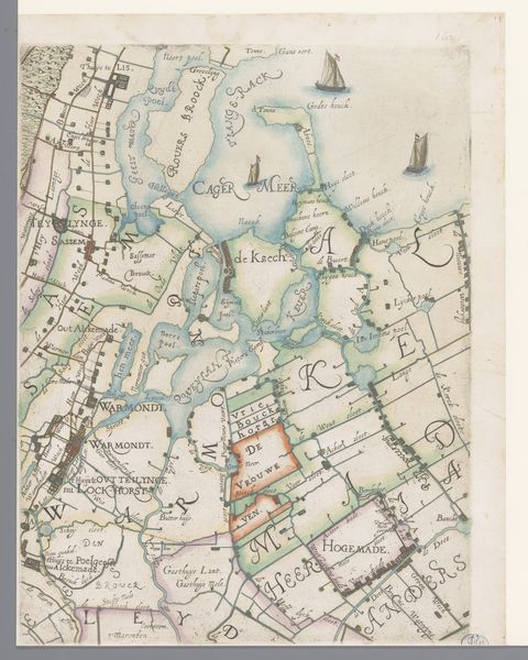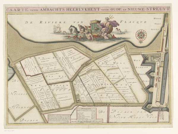 Curator: What strikes me is the overall delicacy of the lines in this set of maps dating from 1700 to 1735, detailing polders in Waterland and Watergraafsmeer. Look at the way the artist uses watercolour on paper to capture these regions! Editor: It feels so orderly, doesn't it? Almost... regimented. The pale greens and pinks give it a soft, almost ethereal quality, but the straight lines and divisions feel very purposeful. I wonder about the lives lived within those carefully plotted spaces. Curator: Indeed, it's important to understand the context here. The Dutch Golden Age was a time of intense land reclamation and these maps would have been crucial tools for managing and developing these territories. They represent both an understanding of, and an attempt to control nature. Editor: Control, yes, that's it! There's an undeniable sense of wanting to tame something wild. But there’s also beauty, don't you think? The watercolour bleeds and softens those hard lines just enough to let the imagination wander. Curator: The beauty is, in part, intentional. Mapmaking in this era wasn't purely functional. Maps were also statements of civic pride and economic power. Their presentation, the lettering, even the colours chosen, were all part of projecting an image of prosperity and stability. Think of them as infographics, but with added artistry. Editor: Like little framed real estate brochures? Only far more elegant. All this reclaimed land. So orderly. Still, a question arises: Did all that ordering of nature ultimately allow for freedom, or was freedom sacrificed to its design? Curator: That's a complex question, of course, but one well worth considering. It highlights the constant push and pull between individual autonomy and collective organization in Dutch history. The relationship is still relevant today. Editor: Definitely. It gives me a new perspective when I look at maps. They're not just neutral guides. They are charged with politics, ambition, and even, dare I say, poetry! Curator: Absolutely. Seeing these antique renderings as objects reflecting this history changes the perspective for me too, providing context that enables appreciation on both aesthetic and intellectual planes.