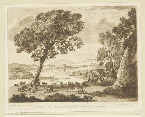 Richard Earlom composed this sepia-toned aquatint landscape scene of a hunter resting among goats in 1774. Note how the goats, symbols of virility and untamed nature, mirror those found in classical bacchanals, yet here they are pastoral, a tamed echo of Dionysian revelry. Across time, the image of goats has transformed from potent symbols of pagan ritual to picturesque elements within a serene landscape. Consider the figure of the hunter: he embodies a blend of action and contemplation, a classical motif that has been passed down from antiquity through the Renaissance. He is the active will, paused, yet ever-present. The bridge in the background is a symbolic link between the man and nature, but also past and future. These elements appeal to the collective subconscious, stirring deeply rooted emotional responses associated with our relationship to nature, time, and the self. Observe how these motifs recur, evolve, and are imbued with new significance across different epochs.