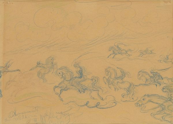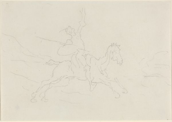 Curator: This is Charles Rochussen's pencil drawing, "Twee ruiters en een liggende man," which translates to "Two Riders and a Lying Man," created somewhere between 1840 and 1860. You can find it here at the Rijksmuseum. Editor: It feels like a fleeting thought, doesn’t it? A momentary vision sketched in haste. The sparse lines give it such an ephemeral quality. Curator: Absolutely. Rochussen captures a dynamism that’s characteristic of the Romantic period, though it's more like a whisper of action than a grand statement. What do you make of the figures themselves? Editor: The two riders appear almost jaunty, despite what seems to be happening with the fallen figure on the left. The horses have this frantic energy, a sense of urgent escape. Curator: He seems to be gesturing as the riders move away from him. It reminds me a little of battlefield scenes from that era – but also it is like a rejected idea from an old Western! Do you see something particular in the use of light here? Editor: It’s almost entirely devoid of strong contrast. Everything's rendered with a similar soft gray, creating an atmospheric haze. It obscures the specific narrative and emphasizes a kind of… dreamlike state. Is this common for similar sketchbooks from this period? Curator: Exactly. That lack of specificity allows viewers to project their own narratives onto it. And within Romanticism, memory and emotion are often veiled rather than laid bare. Think about how the soft rendering also lends the figures a spectral presence. Editor: Perhaps it evokes that liminal space between waking and sleeping, the moment when impressions are strongest and logic loosens. Curator: Right – so maybe we are free to imagine who these men were, why one is on the ground—dead or alive—or just how romantic this encounter should feel to us. Thanks to the minimal pencil work and open-ended drama, "Two Riders and a Lying Man" makes its mark as a masterwork of understated poignancy. Editor: Indeed, an unforced glimpse into an artist's visual musings from the nineteenth century! I won’t soon forget it.