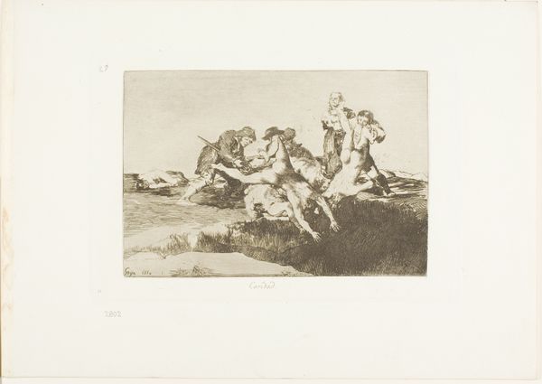 Curator: Goya's "Rejoice, Carnival, For Tomorrow Thou Shalt Be Ashes: Carnival Folly" is a real mood, isn’t it? I immediately get this sense of… suppressed frenzy. Editor: Indeed. The etching technique lends itself to a stark contrast, emphasizing the grotesque masks and distorted figures in the foreground. The eye is drawn immediately to the central pairing, their faces nearly touching. Curator: Exactly! Like they’re sharing some dark secret, or maybe just egging each other on before everything goes to hell. It's that pre-party anxiety, amplified. Editor: The composition, however, is more complex. The elevated figure in the background seems detached, almost a voyeuristic observer to the chaotic energy below. Curator: Right, like a reminder that there's always someone watching, or that consequences are coming. It makes you think, what am I really celebrating, and at what cost? Editor: Perhaps Goya intended to critique the superficiality of fleeting pleasures. The implied moral narrative, though ambiguous, is palpable through the formal arrangement of figures and their interactions. Curator: That’s a great way to put it. This piece sort of makes you feel like you should always be thinking one step ahead, even while you’re living in the moment.