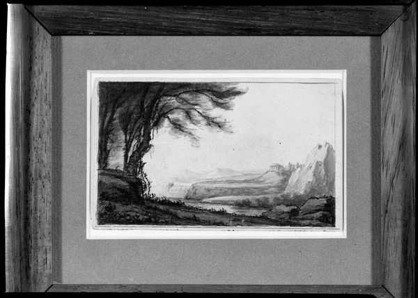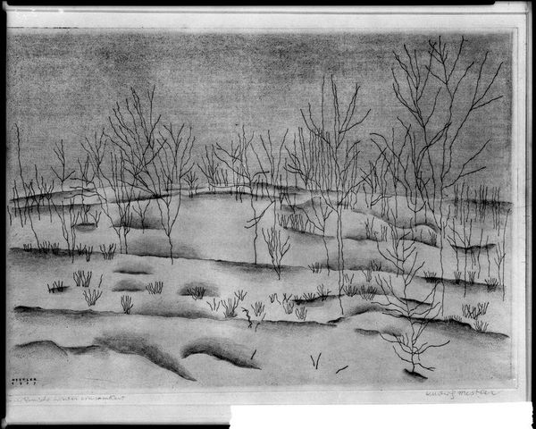 Editor: Here we have Alfred Freddy Krupa's "At the Kvarner Bay," created in 2000 using ink and charcoal. There’s something very stark and contemplative about this monochrome landscape. What stands out to you most? Curator: It is evocative, isn't it? Immediately, I’m struck by the cultural memory embedded in the Sumi-e style. Think about the Zen Buddhist concept of emptiness, ‘Mu.’ Do you see how the artist utilizes negative space not as absence, but as potential? Editor: I do see that, how the empty space shapes the scene, in a way. What does that signify for you? Curator: It is as though the artist invites us into a state of ‘Satori’ – a flash of awareness. Those skeletal trees… are they barren or are they silently promising spring? This duality plays into the symbolic tension so beautifully. Even the starkness evokes 'Wabi-sabi', a world view centred on the acceptance of transience and imperfection. Editor: It's fascinating how different traditions blend within it, but why render it so sparse? Is there more to those minimalist shapes? Curator: Absolutely! It could suggest the bare bones of reality; the foundational aspects of the region stripped bare to expose deeper truths, or perhaps simply alluding to nature’s power and human limitations. Editor: It seems like a reflection on simplicity, or perhaps even resilience. Thank you for illuminating all that! Curator: And thank you for helping me look at it with fresh eyes. The conversation has indeed been very enlightening.