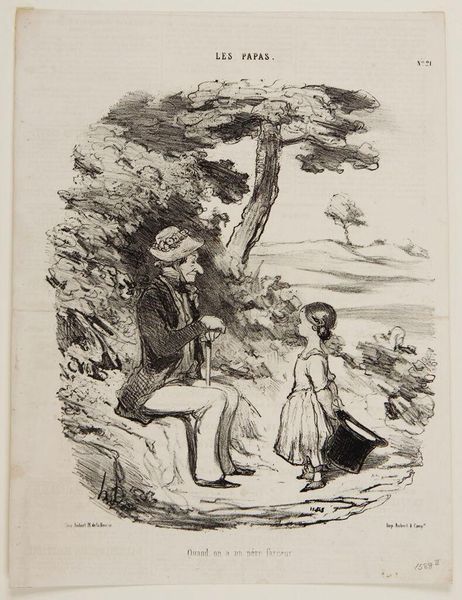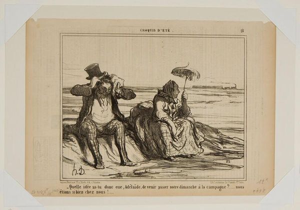 Curator: Honoré Daumier's lithograph, titled "Oh! those must be birds of prey...They're eating grapes!" presents us with a humorous scene. The artist, born in 1808, gives us an image of the French Bourgeoisie. Editor: It has a satirical edge, doesn't it? The upturned face of the man, the dog’s quizzical expression – it all feels intentionally absurd. Curator: Daumier created this piece using lithography, a printmaking process that allowed for mass production and distribution through newspapers and journals. It's interesting to consider how this accessibility shaped its impact. Editor: Precisely, the medium itself speaks to a certain democratizing impulse, taking what could be high art and making it available for everyday critique and enjoyment. I wonder about the reception within the depicted social classes. Curator: I agree. Considering the cultural context of 19th-century France, Daumier's work held a mirror to society, and exposed its flaws using a highly accessible medium. Editor: Absolutely. It definitely provides insightful commentary on social perceptions of bourgeois life.