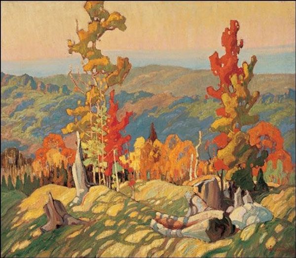 Curator: Here we have Franklin Carmichael's "Scrub Oaks and Maples," an oil painting created in 1935. Editor: Immediately, I’m hit by this intense feeling of brisk, almost biting air. It’s like standing at the edge of autumn, where the colors are bold but the warmth is definitely fading. Curator: Carmichael, as a member of the Group of Seven, was deeply invested in portraying a uniquely Canadian landscape. This work exemplifies their ethos, focusing on the raw, untamed beauty of the northern wilderness. We should perhaps consider its particular time frame in the midst of Canada defining itself as its own nation in relation to the British Commonwealth and consider the way painting served the goals of the state and settler ambitions for creating a truly ‘Canadian’ aesthetic by portraying untouched landscapes and romanticized scenes. Editor: I totally see that, the nationalism bit. It's impossible to extract yourself from the fact that this painting belongs to this specific historical juncture, and as such, inevitably communicates an ideology and worldview, regardless of the intent of the artist. That being said, can we also appreciate the actual textures in here? Like, those scrub oaks in the foreground are practically leaping out at me! He’s made them almost monstrous, but in the most glorious way. It is not "sublime" in the classic Western cannon in the aesthetic, but I definitely feel a sense of being utterly dwarfed by them. Curator: Indeed. Carmichael’s impasto technique is very evident. It’s more than just representation; it's an embodiment of the ruggedness. He’s not just showing us trees; he’s communicating a kind of stoic endurance inherent in the Canadian Shield. Editor: I’m also wondering how much the paintings serve as self-portraits, the self of Canada, but the artist's too. How does being immersed in and representing something so formidable alter one's experience of themselves, of the everyday, the self-perception, everything! It's an aesthetic experiment with significant political consequences. Curator: That's well put! It’s that interweaving of individual perception and collective identity, where the art serves to reflect and shape both. This landscape contributes to the grander, sometimes problematic, narratives of national identity and our engagement with the land. Editor: The light playing off those trees gives them so much dimension... anyway, I think that I might go buy myself a wool blanket and sit by a fire. Thanks for lending me your expertise.