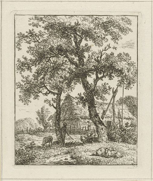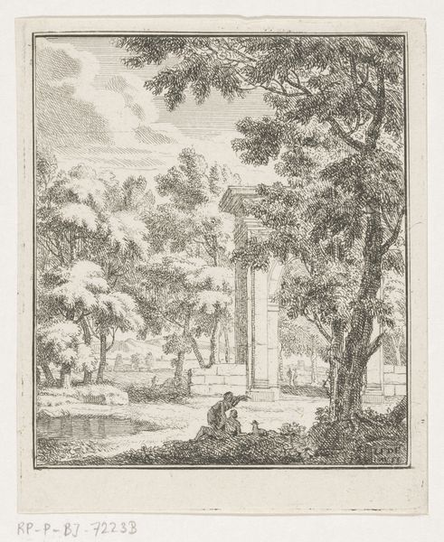 This landscape etching was made by Giovanni Francesco Grimaldi in the 17th century, capturing an idyllic scene dominated by nature and classical architecture. At first glance, the imposing tree on the left, with its dense foliage, directs our gaze. The tree motif is an ancient symbol, often representing life, growth, and connection between the earthly and divine. Think of the Tree of Life across cultures, or the sacred groves of antiquity. Here, the tree stands guard, echoing classical ideals of harmony between man and nature. The house nestled behind the tree reminds us of the architecture found in Poussin’s work. This composition, with its balance between nature and civilization, evokes a longing for Arcadia, a return to a harmonious past that resonates deeply within our collective memory.