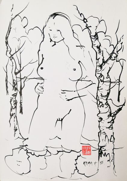 Editor: So, this is "Among the Lines and Stains," a 2014 ink drawing by Alfred Freddy Krupa. It definitely makes an impression; the monochrome palette gives it a dramatic, almost haunted quality. What kind of narrative do you see at play in the marks? Curator: That’s a great observation. Consider how Krupa uses line, specifically. What do you see these lines suggesting to you – are they constricting or liberating, aggressive, or delicate? How does their convergence shape our interpretation of the central figure? Editor: I guess… both? Some are fine and delicate, suggestive of the figure, but others feel more like slashes, almost obscuring her. I’m unsure what to focus on, and feel like my attention is split. Curator: That conflict is precisely where much of its meaning resides. These bold, dark strokes surrounding a seemingly fragile figure speaks volumes. Think about the symbols of enclosure and exposure and the contrast between what's hidden and revealed within human memory. What continuities might be embedded from history into current contexts around how female bodies are displayed? Editor: I see what you mean. It is about layers of meaning and interpretation through art history. Curator: Exactly. It transcends a simple representation of a nude body and engages with much broader themes of vulnerability and how women have been rendered through image making, laden with cultural significance. Editor: I never considered all the history intertwined with that approach! I now appreciate that Krupa is really encouraging active interpretation, instead of just passively looking. Curator: Indeed. The symbol of the gaze – what is shown versus what's obscured – challenges our role in viewing the subject. Understanding these embedded symbols certainly changes how we look at contemporary images.