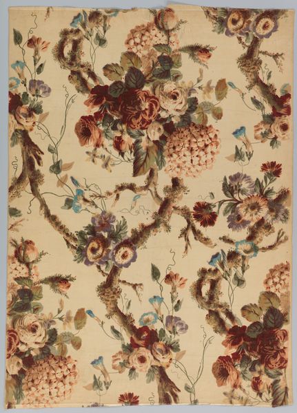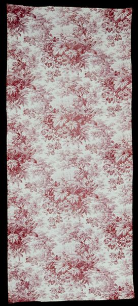 Editor: This is a woven textile panel by Mathevon et Bouvard, made sometime between 1860 and 1880. The repeating pattern of roses is lovely, and I immediately think of the Romantic era, but what is compelling to you about this piece? Curator: I see a garden of coded messages. The roses, a symbol of love and beauty, repeat in a calculated manner. But note how some roses are deep red, almost melancholic, while others are faded, closer to white. What stories of love, loss, or the passage of time do you think are encoded within this seemingly simple floral design? Editor: I hadn't considered the contrast between the roses in that way, I just took it at face value as decoration. The variation of color creates almost a narrative contrast. Curator: Exactly. And it goes beyond just color. Look closely at the placement, how each cluster relates to the others. Is there a visual rhythm at play, a subtle heartbeat echoing sentiments beyond mere adornment? Consider that these motifs were not just aesthetically pleasing, but they also might have served as identifiers and carriers of emotional intent and specific messaging between the maker and intended users of this fabric. Editor: So, the makers were not simply creating decorative fabric. The different arrangements of the flowers might carry meaning that could be unlocked. Is that reading too much into the art? Curator: I think that exploring this symbolism gets to the very heart of why images and patterns hold such enduring power for us. If the image resonates emotionally, that's valid. Editor: This panel is much more profound than I initially thought. Looking at decorative art from the position of storytelling provides a whole new perspective! Curator: I agree. Remember that everyday images were carefully conceived to signal affiliations, values, and emotions; their apparent simplicity is deceptive and worth decoding!