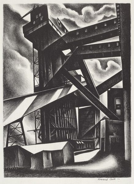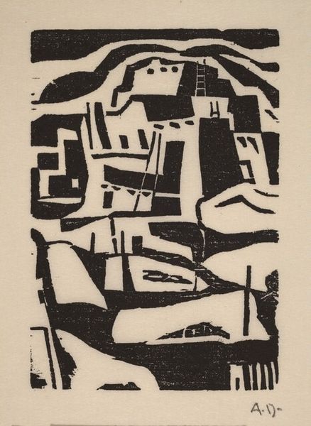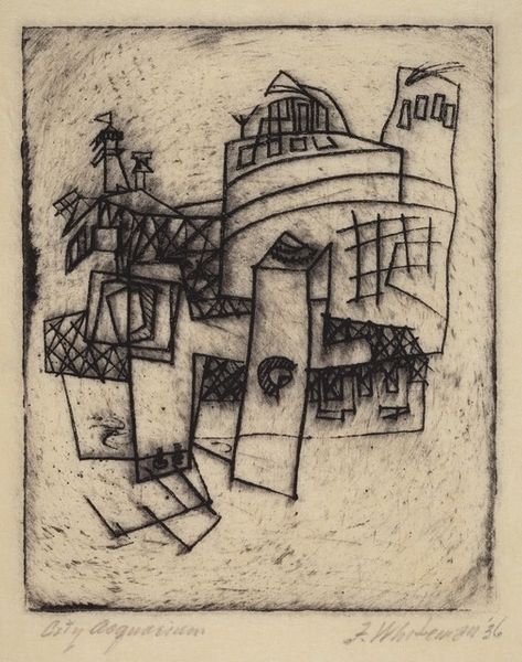 Editor: This is Lajos Vajda's "Lelátás a templomdombról," or "View from the Temple Hill," made in 1929. It's a drawing rendered in graphite and charcoal. The scene is really striking; everything's broken down into these angular, almost violent shapes. What do you see in this piece, particularly given its historical context? Curator: What I see is a fracturing of identity mirroring the interwar period. Vajda was working in a time of immense social and political upheaval, and this deconstruction of the cityscape – traditionally a symbol of stability and community – speaks volumes. Do you notice how the geometric forms seem to clash rather than coalesce? Editor: Yes, it’s almost as if the city is collapsing in on itself. There's no real harmony. Curator: Precisely. And that disharmony is deliberate. Considering Vajda’s later interest in surrealism and his engagement with the horrors of the Holocaust, this early work can be interpreted as a premonition. It is a visual representation of the anxieties and precarity of Jewish identity and life in Hungary at the time. The abstracted forms might even symbolize the dehumanization inherent in fascist ideologies. Does this change your interpretation at all? Editor: It does. I was initially drawn to the abstract aesthetic, but now I see a deeper, more unsettling message. The violence of the shapes feels much more purposeful. Curator: Exactly. Art is rarely made in a vacuum. By understanding the socio-political context, we unlock new layers of meaning and significance. And perhaps that fractured reality also gave rise to his exploration of dualism and the search for spiritual connections in his later, surrealist works, using folklore symbols within art to transcend reality. Editor: This has given me so much to consider. I'll definitely look at Vajda’s later works to trace the development of these themes. Thanks for the insight.