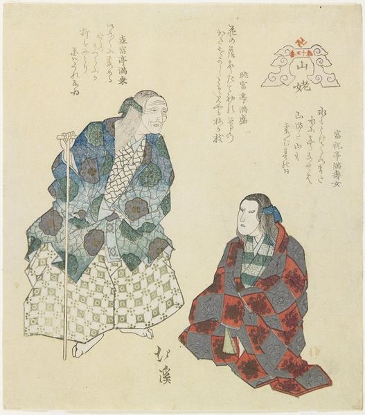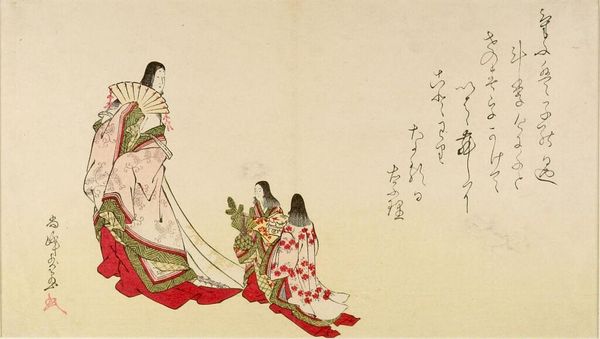 Curator: Here we have Kubo Shunman's print, "Court Lady Serving Sake to Otomo no Yakamochi," featuring added poems. Editor: It's quite delicate, isn't it? The lines are so fine, the colors muted. Almost like a whisper of a scene. Curator: Indeed. Shunman, active in the late 18th and early 19th centuries, places this imagined scene of hospitality within a broader cultural context. The materiality of the paper, the woodblock printing process – these elements speak to a specific moment of artistic production and distribution. Editor: I’m intrigued by the sake serving ritual. How does this connect to labor, class, and the consumption of luxury goods in Shunman's era? And is it luxury, really, if it's captured on a mass-produced print? Curator: The image certainly evokes questions about the nature of cultural production itself. Perhaps the mass production democratizes access to such imagery? Editor: Perhaps, or it commodifies it. Still, there’s a quiet charm to the scene. The artist uses line and color to elevate the scene in an appealing manner. Curator: A fascinating interplay of culture, class and context. Editor: Yes, an echo of hospitality rendered in ink and paper.