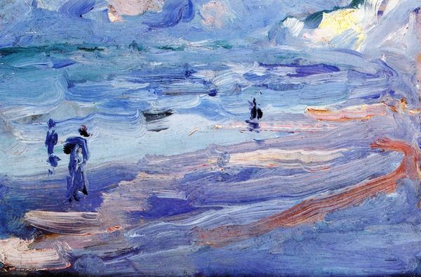 Childe Hassam’s painting presents a scene with wild swans, probably made with oils. The painting is made with a real looseness of mark making, particularly in the scrubby foreground. It's like he’s trying to record an impression rather than a perfect depiction. The color palette is quite muted and earthy, mostly browns and blues, giving it a kind of classical feel, which feels appropriate given the title. Looking at the texture, the paint seems applied pretty thinly, almost like a stain in places, which lets the surface breathe. The gestures in the foreground create this chaotic energy that contrasts with the serene figures by the water. I find it interesting how he suggests form with just a few strokes, especially in the figures. It reminds me of some of Manet’s work, where the figure becomes part of the landscape. I think it’s art that embraces the sketchiness, and invites us to complete the image in our minds.