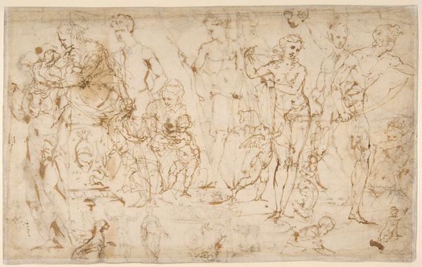 Editor: This drawing by Parmigianino, titled "Hercules with the Apples of the Hesperides, a Priestess with a Hastening Winged Putto," renders figures in ink on paper. It has a dynamic feel, a lot of movement despite being a static image. How do you interpret this work, especially concerning the role of its figures? Curator: This piece speaks volumes about power, gender, and access in the High Renaissance. Hercules, typically a figure of masculine strength, is here almost offering the apples, suggesting a transfer of power or knowledge. Notice the priestess; she's not just a passive recipient. How does her position challenge or reinforce existing social structures in your view? Editor: I see her as being actively involved, almost as a negotiator, deciding who gets access. The winged putto further emphasizes this sense of facilitated transaction. Curator: Exactly. The putto and the priestess complicates a simple narrative of Herculean strength. It pushes us to think about who controls access to symbolic power - represented here by the apples. Think about the Medici court - would this have any relevance within those elite circles? Editor: It seems like a critique of limiting knowledge to only those who are deemed worthy, perhaps suggesting that wisdom should be shared more broadly. Curator: Precisely. Parmigianino seems to be making a statement about intellectual gatekeeping within the religious or aristocratic structures of his time. Consider also the aesthetic: how does the medium of drawing - so immediate, so personal - inform this critique? Editor: That’s a great point. It gives the drawing a sense of intimacy and directness that enhances its message. Curator: Agreed. And in engaging with it today, what resonances do you find in our contemporary world? Who are our Hercules, our gatekeepers? Editor: It makes me think about access to resources and knowledge in our digital age. Curator: Yes! Thinking through the lens of access reveals lasting and current social justice issues, brilliantly encapsulated in what seems to be a mythological snapshot. Editor: That's a perspective I hadn't considered. This really reframes how I understand Renaissance art and its connection to today's issues.