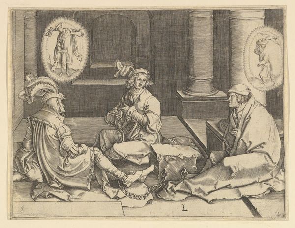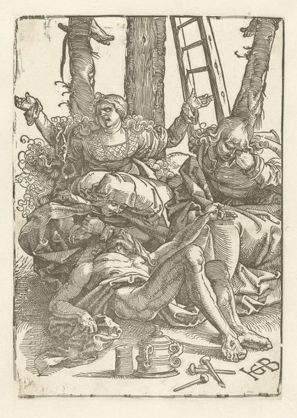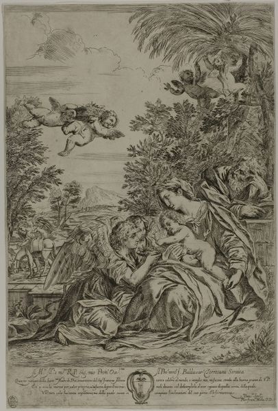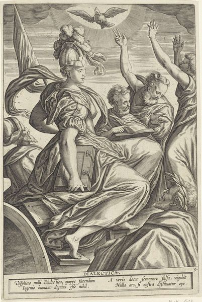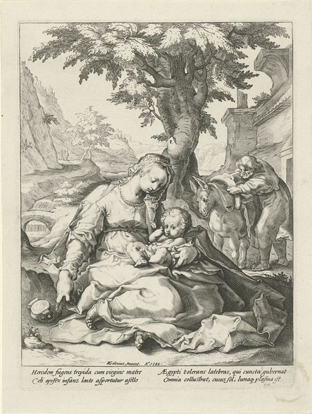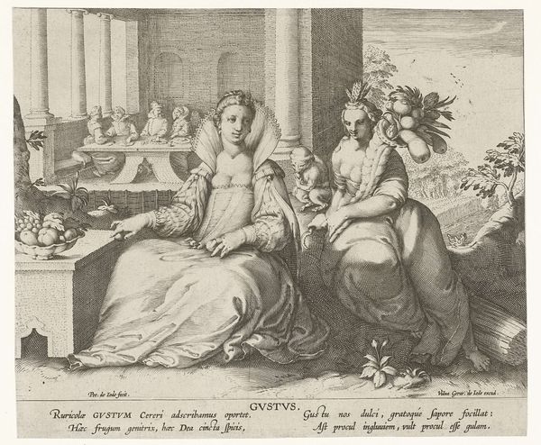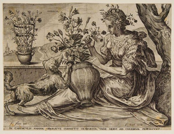 Curator: Cornelis Cort created this engraving, "Smell," sometime around the late 16th century, currently held at the Harvard Art Museums. It's a detailed allegorical scene. Editor: Immediately, I'm struck by the abundance of floral imagery – the woman adorned with blossoms, the overflowing vase, even the landscape feels perfumed. It evokes a strong sense of idealized sensory experience. Curator: Indeed. Note the meticulous rendering of the flowers, their textures almost palpable through Cort's engraving technique. It demonstrates the labor involved, a material transformation of observation into art. Editor: Beyond simple representation, flowers often carry symbolic weight: purity, love, ephemeral beauty. Here, combined with the reclining figure, it speaks to the ephemeral nature of sensory pleasure. The dog, too, adds layers, a symbol of fidelity but also instinct. Curator: The printmaking process itself is key here. The lines etched onto the plate, the pressure applied to transfer the image—these speak to a broader culture of reproduction and dissemination of knowledge. Editor: A fascinating synthesis of nature, artifice, and symbolism. It's a reminder of how deeply intertwined our senses are with cultural meaning. Curator: Precisely. Reflecting on this highlights just how much labor underlies even the most seemingly simple allegories.