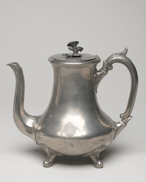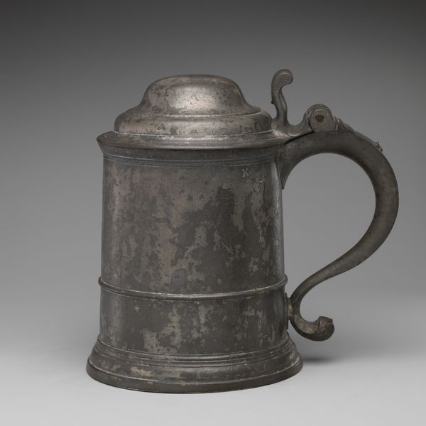 Editor: We're looking at a Church Flagon from the early to mid-18th century, made of metal. It feels austere, yet there's an elegance to its simplicity. What can you tell us about it? Curator: This flagon offers a window into the complex power dynamics between the Church and everyday life during that era. What stories might this object whisper about wealth, faith, and social hierarchies? Editor: Social hierarchies? It’s just a container, isn’t it? Curator: Think about access, Editor. Who had access to objects of such craftsmanship, even relatively modest ones like this? Consider the materials and labor invested. Baroque art and decorative art aren't solely about visual aesthetics, they often served as tools of representation and social validation for the elite, reinforcing specific religious and social narratives. Can we see any indications about the society of its time in its shape, form or decoration? Editor: I see your point. The floral motif on the lid… Curator: Exactly. Decoration was deliberately chosen, reflecting cultural values and, quite often, religious beliefs. But beyond the overtly religious symbolism, explore who *wasn't* represented in this flagon, whose labor was extracted, whose stories were omitted. The unacknowledged makers. What narratives does the piece actively suppress through its singular focus on established power? Editor: So it's not just about appreciating the craftsmanship, but also about questioning the social context it represents. It definitely gives a new perspective to simple-looking pieces such as this one! Curator: Precisely. By engaging with both its visual language and its historical embeddedness, we gain insight into that era's structures of power, privilege, and exclusion. That’s a powerful tool to view artifacts through, and challenges us to expand our perspectives.