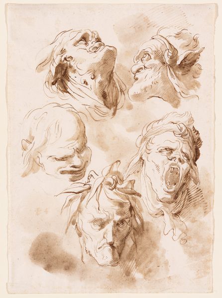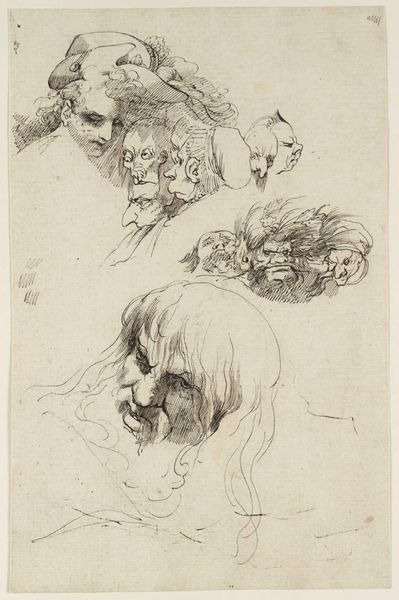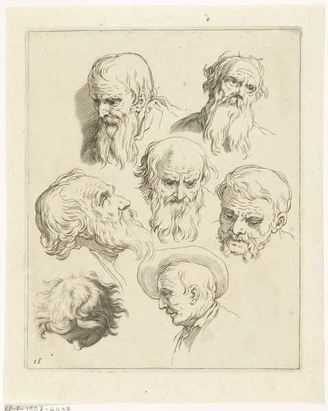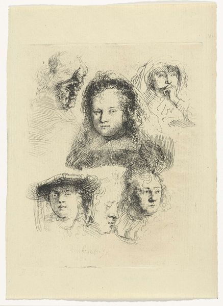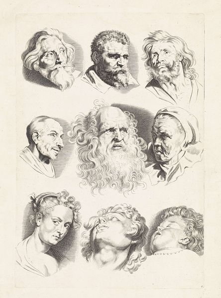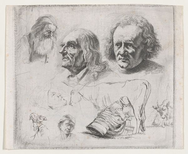 Editor: This is Jean Jacques de Boissieu's "Thirteen Studies", held at the Harvard Art Museums. I’m drawn to the variety of the figures depicted, and how they seem to emerge from the paper itself. What can you tell me about this etching? Curator: Look closely at the lines, the textures he creates. Boissieu's process is key: etching, a form of printmaking, allows for reproducibility and wider distribution. Consider how this affects the value and accessibility of art. Was he elevating craft, or simply responding to market demands? Editor: So, it's less about the individual faces and more about how the image came into being and its place in society? I hadn't considered that. Curator: Exactly! Think about the labor involved, the materials used, and who would have consumed these images. That’s the real story here.