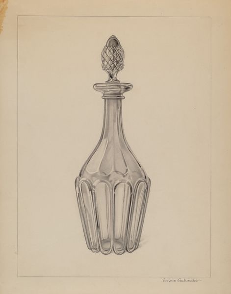 Curator: Looking at this graphite drawing, created circa 1936, we see Samuel O. Klein's “Carafe,” a study in geometric form and reflected light. Editor: My first thought is one of constraint. There's something austere about this rendered object, a heavy elegance but so... contained. Is it simply a consequence of being monochrome? Curator: Perhaps the restriction of graphite serves a purpose. Klein invites us to appreciate the subtleties, drawing out form and structure, without the distractions of color. Glass, as a subject, becomes incredibly potent with symbolic weight when reduced this way. Editor: I see what you mean. Glass historically, across cultures, has signified clarity, fragility, even status depending on who owned the vessel, its quality, what they poured from it. But rendered in such precise shades of grey, it gives it an almost somber, reflective, presence, does it not? Was Klein exploring themes related to austerity in the 30's, in this specific drawing? Curator: The 1930s was certainly a decade marked by economic and social hardship, a climate affecting perspectives of beauty, utility and domestic objects. Looking closer at the craftsmanship, the geometry suggests almost classical proportions – this object refers to ideals of domestic sophistication and hints at cultural rituals of gatherings at table, yet made simple, rendered on paper, to be a part of life. Editor: Absolutely, a fascinating collision of societal context and idealization. The repetitive fluting towards the bottom is somewhat brutal, too – that upward thrust feels like a challenge against its graceful container; a commentary on aspiration versus actual social immobility, potentially. Curator: Intriguing – an object speaking silent commentary about social structure! To conclude, Klein’s artwork is a quiet monument that reveals a society facing immense changes reflected back to us through symbolic choices of what constitutes refinement in design. Editor: Exactly! A silent rebellion maybe that's all a contained carafe can actually embody for some under restrictive situations. I walk away seeing beyond a study in geometrical shape to a potent artifact.