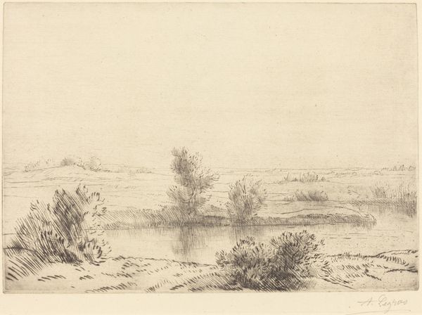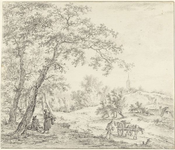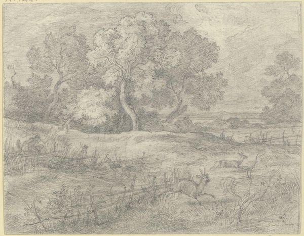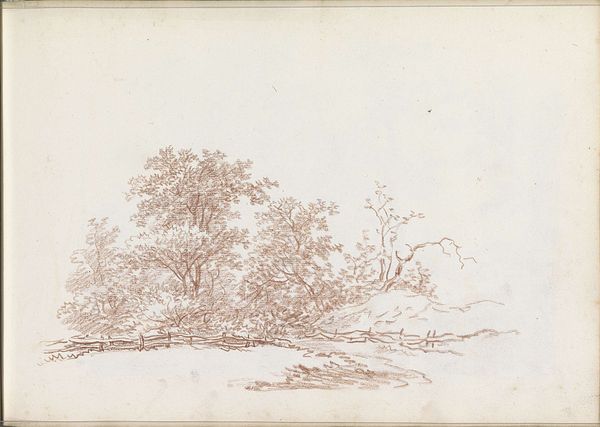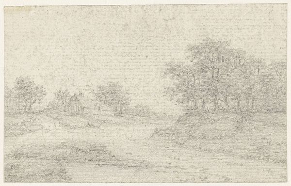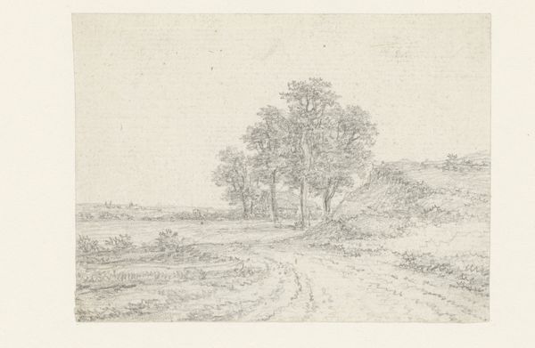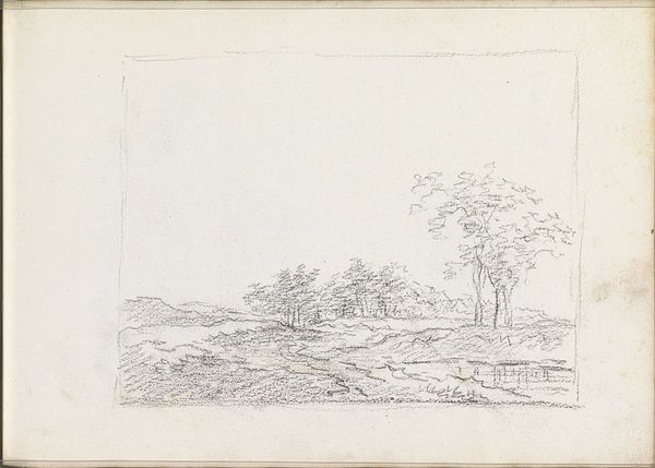 Curator: This drawing, entitled "Twee bomen op een helling" or "Two Trees on a Slope," is attributed to Georges Michel, dating roughly between 1773 and 1843. It's rendered in pencil, capturing a fleeting moment in nature. Editor: It’s incredibly subtle, almost a whisper of a landscape. The pencil work is so delicate, giving it this ethereal quality. It's got such simplicity and bare minimum, so peaceful, though…sparse. Curator: Sparse, perhaps, but consider the historical context. Michel was working during a period of great social upheaval, the rise and fall of Napoleon, the shift from aristocracy to bourgeois power, all these tumultuous events unfolding while he’s sketching seemingly simple landscapes. Was he interested in depicting this era in history by using just landscapes? What do you make of this choice? Editor: It's interesting that you mention the tumultuous events surrounding its creation. You know, viewing it materially, I'm immediately drawn to the obvious. It looks like he just reached for paper and pencil—easily accessible and reproducible materials—making art creation a practical, immediate act, a common commodity. It feels almost like he wanted everyone to relate and create art using what they had at their disposal at all times. I see the message here… art is for everyone. Curator: I agree. Also consider that, though he wasn't particularly successful in his time, Michel's landscapes often depicted the outskirts of Paris. Could these be a kind of subtle commentary, perhaps an escape from the urban landscape he saw as part of the art market to a place anyone can enjoy? A form of social commentary through artistic choices? Editor: I hadn't considered that angle, very clever! Looking at it through that lens adds another layer to my understanding of the materials and making; maybe he was thinking that something can be truly profound in simple form, without relying on traditional methods and lavishness. It makes you rethink the purpose of art, who it is truly for, right? Curator: Precisely. A seemingly straightforward sketch like this, “Two Trees on a Slope,” opens a fascinating dialogue between the artist’s life, social forces, accessible tools, and materials. I guess it could become a point of contemplation… even meditation if we give ourselves to that interpretation. Editor: Absolutely! It’s truly amazing how a drawing created out of nothing can invite one to go very deeply to think about history, art’s purpose, accessibility to its creation, among others!