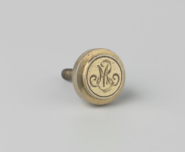 Editor: What strikes me immediately is the sheer extravagance, the golden sheen—it feels almost baroque in its ostentation. Curator: Indeed. What we're looking at is an object titled "Wandelstokknop, toegepast als cachet"—a walking stick knob used as a seal—crafted around 1751 by Zacharie Neau. The material interplay is also notable, look at the melding of gold and another metal, seemingly silver. Editor: The process of creating something so detailed out of gold! The labor that must have gone into the chasing, the carving... You really get a sense of the value placed on status and display during that era. It's not just functional; it's performative. Curator: Precisely. Consider the dense ornamentation, its swirling motifs that suggest the movement and dynamism characteristic of the Baroque style, especially within the limited space dictated by its physical form. Do you observe how each element, while distinct, contributes to an overall unified aesthetic? Editor: And beneath the knob, we can see an engraving on a silver disk—it seems to be initials intertwined. A personalized touch that probably also worked functionally to leave a signature. The material carries that mark of its user in a unique way. Curator: Note also how this emblem is deliberately positioned. Its circular format serves to reinforce the cylindrical shape of the knob itself, integrating it with the other linear engravings and chasing, enhancing the piece’s formal coherence. The symbolic potential of the coat of arms surely holds an ideological position related to class and power too. Editor: Absolutely, and the walking stick itself wasn't just a mobility aid; it was a signifier, like a badge of rank. To adorn its tip with such a lavish and meticulously crafted piece elevated both object and user into an obvious social sphere. I'm fascinated by what we might unearth about who might have touched it, who manufactured and traded these precious wares... Curator: So many potential avenues to consider. I'm most affected by its timeless elegance; by closely observing the object's surface design and fundamental form, one uncovers sophisticated methods and intentions woven intricately together, a lasting imprint of creative ambition. Editor: Agreed. A powerful encapsulation of craft, commodity, and context. It seems, looking at this knob, that such historical items bring with them not just artistic flair, but the echo of voices both of makers and wielders whose stories these items have retained.