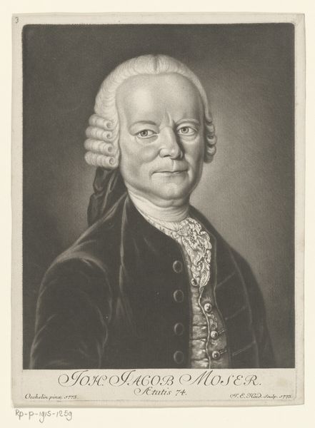 John Dixon created this portrait of Joshua Kirby using mezzotint, a printmaking technique that allows for rich tonal range and depth. The work provides a glimpse into the world of 18th-century artistic and intellectual circles. Portraits like these served to solidify social standing, embodying the sitter's identity within a rigid class structure. The way Kirby is depicted—his gaze, clothing, and powdered wig—speak to the visual codes of masculinity and status of the era. Yet, mezzotint as a medium allowed for a democratization of images. These portraits could circulate beyond the elite, inviting a broader audience to engage with and emulate the values and identities represented. Consider how the portrait reflects societal ideals, and perhaps, even challenges them. What do you make of the emotional connection—or disconnection—you feel with Kirby?