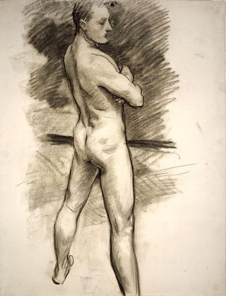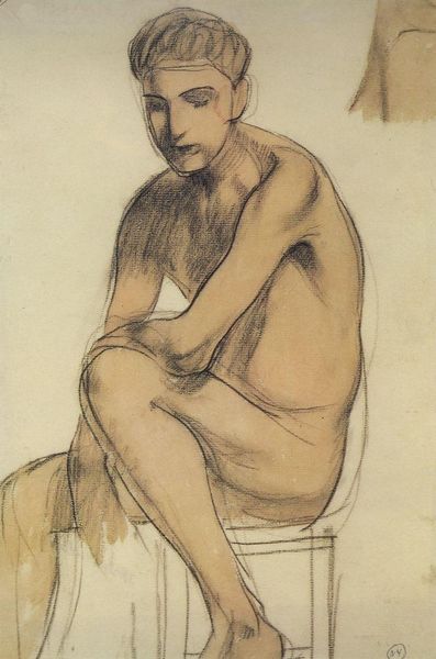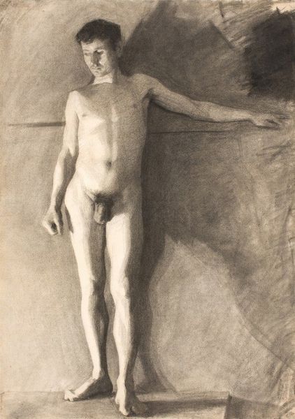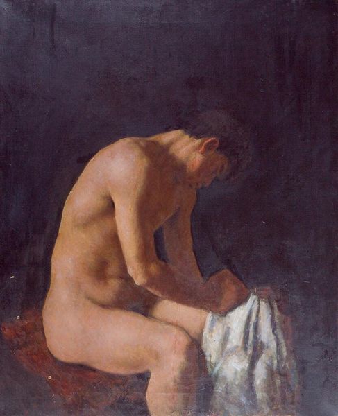 Editor: Here we have Magnus Enckell's "Alaston Poika," an oil painting from 1892. I’m struck by its muted tones and the seemingly vulnerable posture of the young boy. What do you see in this piece, particularly considering the materials and the time it was made? Curator: For me, it's fascinating to consider the societal factors shaping the artist's process here. The very act of portraying a nude figure, especially a young male, was fraught with complex meaning. What kind of social function does that play at this moment of history? We might ask ourselves what were the conventions, what materials were readily available, and how might his process differ had he had access to other modes of making? Editor: So, are you suggesting the choice of oil paint itself has something to tell us? I always thought of it as a default medium. Curator: Exactly. Oil paints, by the late 19th century, were becoming increasingly standardized and commercially available, impacting artistic practice. Enckell using oil paint, we are compelled to inquire, to create this slightly melancholic portrait ties it to the emerging industrial art market and a certain democratization of artistic production. Does the subtle shift away from pure representation toward a slightly stylized and personal one, tell a story? It points, not to genius, but how artistic decisions about medium and execution shape the reception. Editor: That makes a lot of sense. I hadn't considered the commercial availability of the oil paint. It gives another layer to what I see in the artwork. Curator: Precisely. This perspective reminds us to think about how cultural narratives arise around artworks when they move from artist to consumer, when viewed through a social lens that shifts our focus away from the singular artist to production's complex web. Editor: Right, considering materials and the systems around them reveals so much more than just the final image itself. Thanks.