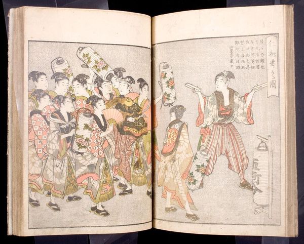 Curator: Here we have Kitagawa Utamaro’s “Procession with Lion Head and Lanterns,” dating from 1804. This woodblock print resides here at the Rijksmuseum, a superb example of ukiyo-e. Editor: My immediate reaction is the density of figures, almost overwhelming! The texture from the printmaking is palpable, like looking at patterned cloth. Curator: Indeed. Utamaro was known for his attention to the working-class culture and is masterful at capturing the dynamism of urban life. The print showcases a festival procession, likely associated with a local shrine or temple. We can imagine the sights and sounds filling the streets. Editor: What interests me is the physicality of the lanterns themselves. The way the light glows through paper—handmade paper, no doubt. You can see the makers' marks if you look closely. Their shapes feel quite robust against the ethereal nature of the print's palette. Curator: The choice to include the lanterns and the lion's head as central components does suggest the significance of popular religion. Ukiyo-e prints such as this were created and consumed in large numbers by the common people. It is also an expression of local civic identity. Editor: I am struck by how many individuals must have touched this work. From the artist creating the original sketch to the artisans carving the blocks to the printers applying the ink to the people buying and trading the images…it reveals how making and distribution processes played important roles in everyday life. Curator: Precisely. Understanding the social mechanisms of art and distribution at this time can provide incredible insight into societal trends and collective aspirations. Utamaro captured this brilliantly. Editor: Seeing the human imprint through craft and material culture in this print enriches our understanding, moving past simple representation towards something lived and experienced. Curator: Absolutely, and placing it within the cultural history illuminates a more intricate understanding of 19th-century Japanese society. Editor: Considering it through a lens of materials and labor allows us to more richly comprehend the social impact of this remarkable print.