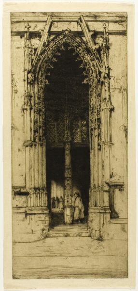Joseph Pennell made this etching, "Entrance to Henry VII's Chapel, Westminster," in 1902. Pennell lays down a carpet of ink, pulling us into this dark space; it’s all about process, about the way that ink can create a whole world. The material itself seems to whisper stories. The texture, the deep blacks, the shallow grays—they're all part of the experience. Look closely and you'll see the scratchy lines, the uneven surfaces. There is a real sense of time and place here, enhanced by the limited palette, as if the color has been bleached away by history. Notice how the lines lead you into the darkness. Like you’re about to enter a secret passage, or perhaps the past itself. Pennell always seemed to be looking for some way to capture light and shadow, just as Whistler, the artist whom he idolized, did before him. It's like a conversation across time, a game of light and dark.