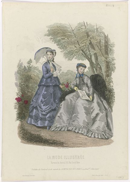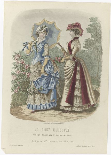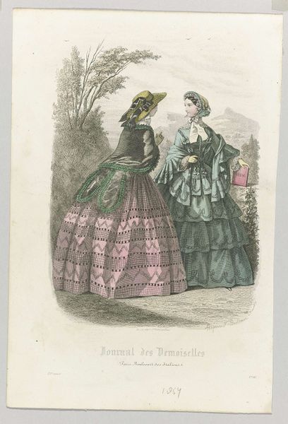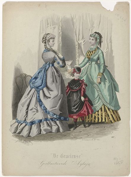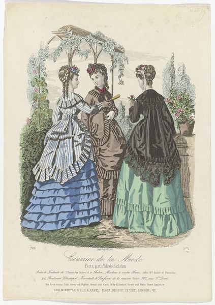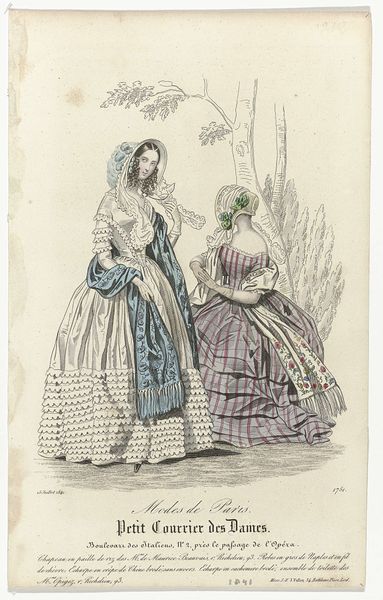 Editor: This is "Les Modes Parisiennes, 25 avril 1847, No. 217" by Gabriel Xavier Montaut d'Oleron, from 1847. It's a print made using lithography, drawing, and watercolor on paper. I'm really struck by the detail in the dresses and how they seem to embody the romantic ideals of the time. What stories do you think this image tells about women in 1847? Curator: That’s a great question. This image is so much more than just a fashion plate. Think about the title itself – "Parisian Fashions." Who dictates fashion? And who gets to participate? The romantic style emphasized ideals of femininity and beauty, but at the same time, these elaborate clothes also signified a certain class status, a certain access. These aren't working-class women; they are women of leisure and privilege. How does the depiction of women’s fashion serve to uphold existing social hierarchies, or potentially challenge them? Editor: So the image both reflects and reinforces those hierarchies by showcasing attainable standards, right? But there's also a sense of aspiration here – maybe it hints at the possibilities that were opening up, albeit slowly, for women's roles in society? Curator: Precisely. Consider the broader social context: this is post-French Revolution, a period of immense social upheaval, yet existing power structures continued to assert themselves, including the constraints placed on women. So, how can this fashion plate, on the surface so seemingly innocuous, be considered as a complex document of gender, class, and power in 19th-century Paris? What contradictions do you observe? Editor: I see it now – the beauty and elegance are almost a kind of… armor? It’s not just about looking pretty, but about signaling status in a society undergoing massive changes. Curator: Exactly! And seeing those layers, seeing the intersections between fashion, social change, and representation, can help us better understand not only art, but also the world around us. Editor: I've definitely gained a deeper appreciation for what this image communicates beyond just its aesthetic appeal! Curator: Indeed. It’s through this lens, questioning the familiar, that we uncover the radical potential in even the most conventional of images.
