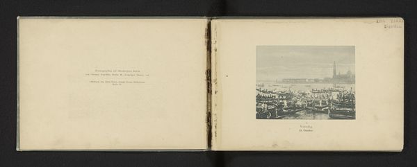 Curator: Right, so here we have an old book open to an illustration – "Gezicht op Milaan met de kathedraal" it's called. Pre-1889. It's a lithograph, almost like a photograph. The way it's bound into this book gives it such an intimate feeling, doesn't it? I’m immediately drawn to the cathedral dominating the skyline... its architectural extravagance really striking, wouldn’t you say? How do you interpret the work? Editor: Absolutely! I agree about the cathedral; it’s like everything is in service to it, the streets radiating out. And there's such detail, like I could spend hours just examining the buildings. What do you make of the sort of washed-out tone, everything kind of pale and faded? Curator: The pale tone definitely lends it a sense of faded glory, a bygone era, wouldn't you say? But also think about what a lithograph is: it's not just replicating reality; it's someone carefully translating three dimensions onto a flat surface. I imagine an artist sketching on site, selecting what to show us. Are they showing you *Milan* or *their impression of Milan* at the end of the 19th century? Does the artist give a romantic vibe of that italian renaissance? Editor: So, it’s as much about a mood or memory as it is about the specific architecture? I like that, it makes the scene feel more personal and evocative than just a picture. Curator: Exactly! And, isn't that the whole point? It’s an invitation to our own memories of a place, and how those get built. Looking at the work... I want to book a flight, and smell the past coming to life in front of me. Editor: Me too, all this art history has me planning trips now, thinking about layers of history I should breathe into life myself!