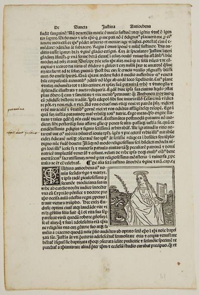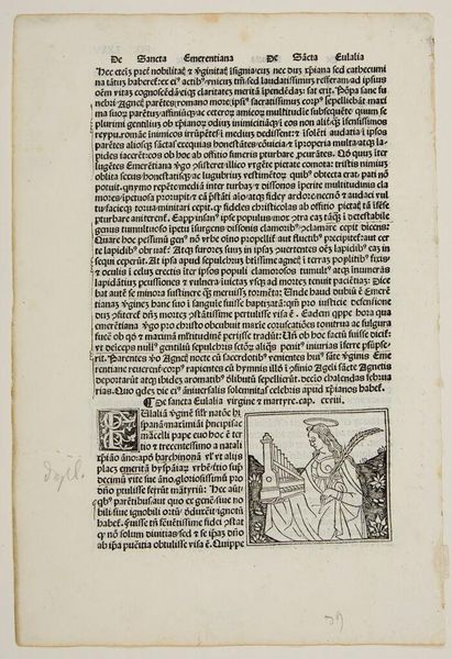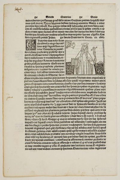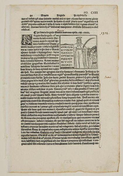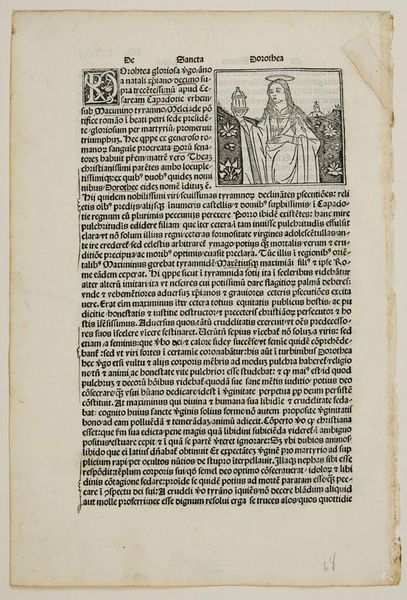 Editor: This is an anonymous print of Saint Mary Magdalene. The printwork seems very intricate, with a density of marks that create a strong contrast. I'm struck by the contrast between the text and the image. How do you interpret the relationship between these two elements? Curator: As a historian, I see the interplay between text and image as central to the work's cultural function. The text is Latin, typical of religious works meant for a learned audience, but the image allows for broader accessibility. The image simplifies a complex narrative for a wider audience, visualizing a key figure and her story. Do you think the image enhances or diminishes the text? Editor: I think it enhances the text by providing a visual anchor. I hadn't considered the different audiences it might reach. Curator: Exactly. It highlights how religious ideas were disseminated and visualized, engaging both literate and illiterate audiences in the devotion to Saint Mary Magdalene. It invites us to think about the politics of imagery. Editor: I learned a lot about the intersection of text and visual culture in this piece. Thanks!