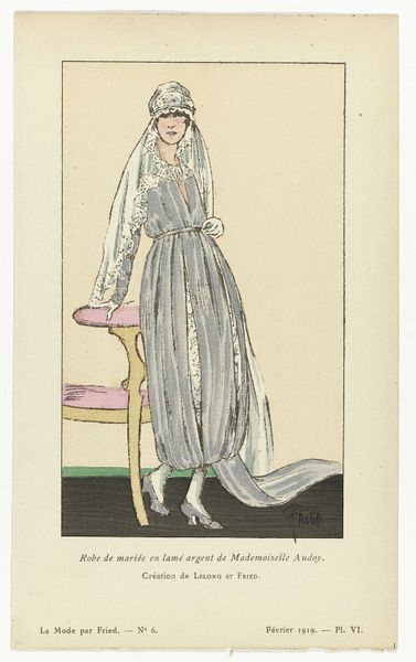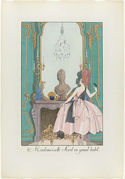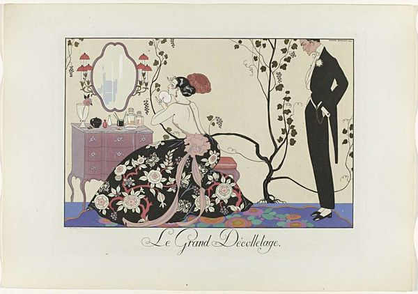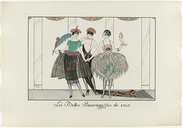 Editor: So, this piece is entitled "Grand-Mère & Petite-fille," drawn by Henri Reidel around 1920. The medium is listed as pen on paper. The contrast between the figures is really striking. It's almost as though the artist created two separate stylistic approaches within the same piece. What’s your perspective on this? Curator: The dialectic of form is precisely where the artwork resonates. Consider the planes – the older woman's dress constructed with gentle curves and implied volume against the granddaughter's sharply delineated geometric skirt. What visual clues might suggest the connection, the lineage, between them? Editor: Well, both figures feature similar colour palettes, muted pinks, blues and the black in the younger woman's skirt looks like a simplified, bolder version of the Grandmother’s ornate gown. What do you make of the use of negative space around the figures? Curator: Indeed, the surrounding void compels us to concentrate on the relationship between these distinct forms. The flatness inherent in the picture plane emphasizes artifice, design. Observe how Reidel has used line to define form rather than model it. Is this simply representation, or are we being directed toward something more conceptual? Editor: I see what you mean. It isn't just about depicting a grandmother and granddaughter, but exploring contrasts in form and design. The Art Deco influence really shines through with that flattened perspective. Curator: Precisely. By isolating these elements, Reidel allows us to dissect them independently and together. Form and function in constant dialogue, generating fresh visual perspectives. Editor: Thanks, it's been insightful looking at how the relationship between the forms drives the meaning. I hadn't considered how intentionally the composition leads you to a specific reading of the image. Curator: And by understanding the arrangement and formal components, we appreciate its intricate design and can engage more fully with its conceptual impact.