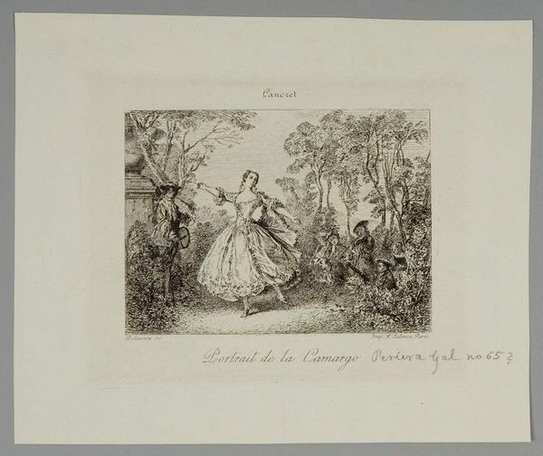 Editor: Here we have Alfred Alexandre Delauney's "Portrait of La Sallé." It's an etching, a technique that always feels so precise. I’m struck by its lighthearted, almost playful mood. How do you interpret the dynamics in this scene? Curator: It's like a whispered secret, isn't it? Delauney captures a moment of pure, unadulterated joy. It feels like a memory, a glimpse into a world where artifice and nature waltz together. The dancers, the musicians... they're all caught in a timeless dance. The neoclassical architecture hints at formality but the figures don’t follow its lead. It’s as if Delauney’s suggesting we let go and join the revelry! Editor: I love that—a waltz between artifice and nature! I hadn’t quite seen that before. Curator: Art is all about finding your own waltz partner, wouldn't you agree?