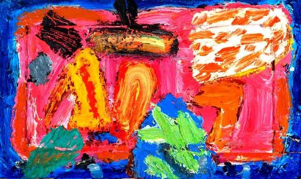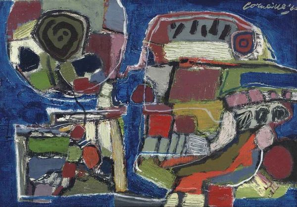 Curator: Woah, intense! It hits you like a fever dream, doesn't it? Like trying to remember a story that’s all broken up. Editor: I can see why you say that! What we're looking at is a work entitled “Abstract”, painted with acrylics, by Walter Battiss. You’ll notice its unrestrained gesture, characteristic of abstract expressionism. Curator: Exactly! So much implied motion and feeling crammed into one space. Those raw colors... it's like the canvas is a battleground for emotion. Reminds me a bit of trying to untangle your thoughts after a particularly wild party! Editor: And think about Battiss. A South African artist engaging with abstraction, trying to express inner states, the unsayable. I can’t help but wonder what personal mythology, what history he was trying to process. The recurring motif of circular shapes also reminds of cellular bodies under microscopic view! Curator: Mythology, huh? I dig it. Like primitive cave paintings updated for the modern existential dread. This thing doesn't feel 'decorative' at all, more like a desperate howl made visible. I even sense a submerged memory. Maybe Battiss was inspired by microscopic universes! Editor: Precisely! He was constantly searching for a primal state of being. You see in the bold use of contrasting color the psychological symbol of tension that echoes through generations. The circular shape calls for some protection. Is this is the essence of all the forms? A constant search for safety from a hostile world? Curator: Maybe. Or maybe it's all just a big Rorschach test and we are all just projecting. I keep coming back to this idea that it looks like a dream you can almost grasp but that constantly evades understanding. Editor: And perhaps that is the beauty of it, inviting such personal interpretations and emotional engagement. It acts as an open symbolic gateway. Curator: Amen to that. Okay, on to the next vortex of feeling.