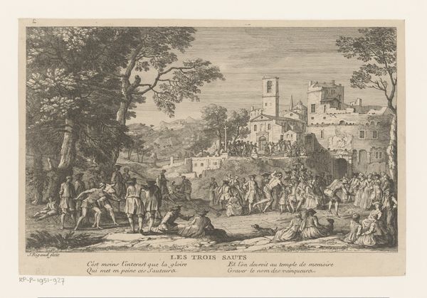 Editor: This is "Landschap met vissers," or "Landscape with Fishermen," an engraving dating back to sometime between 1749 and 1806, currently housed in the Rijksmuseum. It’s by Francesco del Pedro. I find the whole scene very tranquil. What strikes you when you look at this piece? Curator: Tranquil is a lovely word for it. For me, this piece whispers tales of 18th-century leisure and perhaps, even commerce. I mean, look at the almost theatrical composition—the light, the poses! Don't you think there’s a gentle irony, placing this leisurely scene with text referencing global trade? Almost a "pastoral fantasy meets gritty reality" vibe. It's intriguing, no? Editor: Yes, that contrast definitely adds another layer! So, the text at the bottom isn't just a description then? Curator: Oh, heavens no! It’s suggesting far more, doesn’t it? That these leisurely activities spring from or are somehow connected to the flow of goods. It connects something delicate and ‘local’ with global networks and flows, which for me, hints at some deeply complex layers beneath this seemingly pretty image! I'm curious, does knowing this influence your sense of its tranquility at all? Editor: It definitely complicates it! There's something almost uneasy about it now. The figures are much more like performers within a market that they may or may not benefit from. Curator: Precisely! Suddenly, those serene figures feel like characters on a stage. What starts as decorative becomes deeply reflective, wouldn’t you agree? Editor: I think so! Now I see the global-local connection that makes me reflect a bit about our position today. I'm grateful for having seen the initial mood in a different light, this changed my perspective for the better! Curator: And isn't that just the magic of art? Always capable of twisting perceptions. It was an enriching journey of insight, dear fellow art enthusiast!