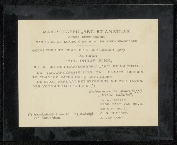 Curator: Here we have an Overlijdensbericht, a death announcement for Willem Maris. Likely created in 1910, this printed poster now resides in the Rijksmuseum's collection. Editor: It strikes me as surprisingly elegant for such a somber piece. The simple paper stock and clean typography, devoid of any embellishment, lends a stark dignity to the announcement. Curator: Agreed. Note the deliberate choice of typography—a formal calligraphy balanced with a straightforward typeface. And its materiality is significant; it’s likely printed in mass for broad distribution. It speaks to the role of printed materials in shaping social rituals. Editor: Precisely. Think of the social dynamics inherent in disseminating such information. The typography dictates a formal, respectful tone and speaks volumes about societal customs and grieving rituals of the era. Also consider the very structure of family, named on this document. Curator: And someone must have designed this. Perhaps a local print shop? The design work here probably reflects local aesthetics and standard printing practices of the day. These posters, or graphic art pieces, can be great examples of craft from that time period. Editor: We also see class subtly expressed. Maris was knighted, which we see on this announcement, marking his family and community position in a society deeply structured around class distinctions and hierarchical rank. Curator: Absolutely, a tangible link to Dutch social history. This isn't just a static image, it's an object involved in the actual practice of mourning and commemoration. Editor: What lingers for me is how this small piece connects to profound emotions—loss, remembrance, familial duty. Curator: Yes, this piece isn't simply announcing a death, it shows how societies have attempted to deal with this phenomenon through process, creation, and distribution of craft and design. Editor: Such objects powerfully remind us how personal grief intersects with broader social and political landscapes. Curator: Agreed. It allows us to appreciate design's presence at all moments, even death.