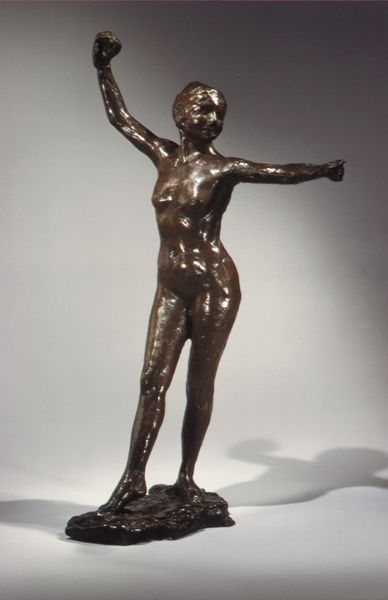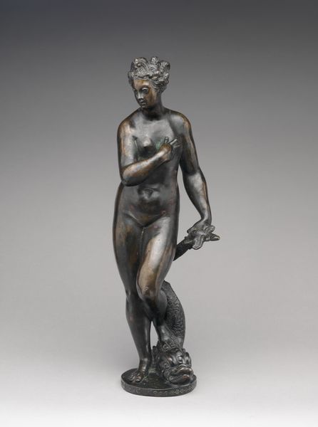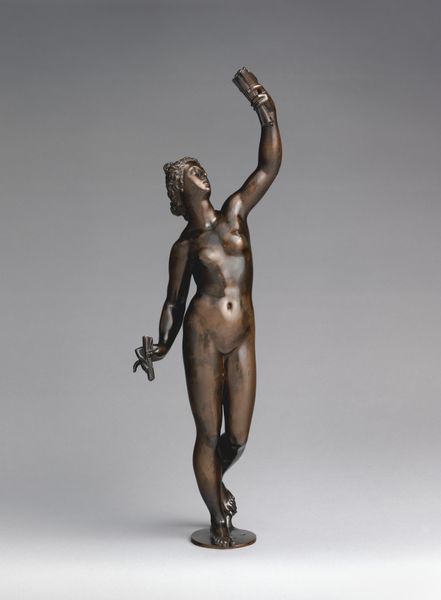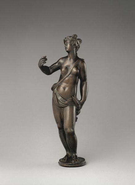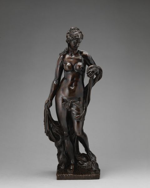 Editor: We're looking at a bronze sculpture called "Eve," likely created sometime between 1800 and 1950. The figure is quite classical, and I'm struck by its intimate scale, contrasting the enormity of the biblical figure it represents. What elements of this bronze rendering do you see at play here? Curator: Note first the closed composition: her arms create an elliptical form around the body. This directs our gaze inward, forcing attention to the curvature of her torso. Observe how the sculptor emphasizes the interplay of light and shadow. How would you describe the surface? Editor: It seems quite polished. And her contemplative gaze contrasts with the tension implicit in the moment depicted: the precipice of knowledge, holding the fruit. Curator: Exactly. Consider, too, the strategic placement of the hands: one concealing, one offering. These gestures function semiotically, revealing the central drama of the biblical narrative within this sculptural form. It creates a tension within the piece as a whole. Does the treatment of surface and gesture seem typical of bronze casting techniques? Editor: Well, to my understanding, the smooth finish allows light to further emphasize these carefully rendered details. The choice of bronze allows the piece to be weighty. Curator: The manipulation of form, combined with the selected material, undeniably heightens the sculpture’s emotional impact. Through careful arrangement of lines and planes, the sculptor invites the viewer to contemplate Eve's internal struggle. Editor: I hadn’t considered how each of the parts creates the final whole. The sculpture feels much richer now. Thank you. Curator: Likewise; new interpretations allow a sculpture to live again and be appreciated afresh.