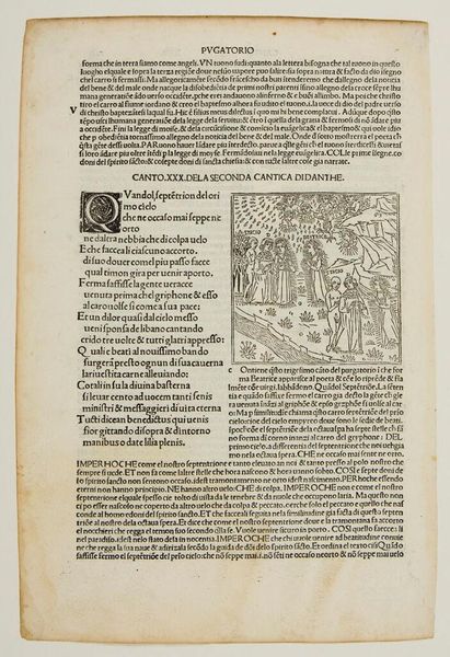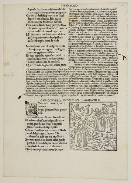 Curator: Let's turn our attention to this intriguing page, "Canto XV. The Second Cornice" from an anonymous edition of Dante's *Divine Comedy*. It presents a woodcut illustration nestled within the text. Editor: My first impression is of a rather stark, almost unsettling dreamscape. The figures seem caught between worlds, both earthly and ethereal, rendered with a sharp, unforgiving line. The cross-hatching gives the whole thing a raw, almost brutal feel. Curator: Indeed, the materiality is key here. Woodcut is an unforgiving medium, demanding precision and leaving little room for correction. That raw quality speaks to the arduous journey through purgatory depicted. Editor: And you can sense the social context seeping through, can’t you? This wasn't made for some pampered elite. Woodcuts were the people's medium, cheaper and more accessible. So, while illustrating high literature, it grounds the divine in the everyday struggle. Curator: Absolutely. This wasn't just about illustrating Dante's vision, but about making it accessible, tangible. The artist, anonymous as they are, becomes a mediator, a craftsman translating spiritual concepts into a material form for a wider audience. It invites us to consider the labor and the consumption of the image. Editor: Exactly! And to think about how the visual and textual interact. The image amplifies the text. A conversation across mediums. It highlights the physical and spiritual labor undertaken in Dante's ascent. It's as if the artist is saying, "Look closely, contemplate the cost." Curator: A powerful reminder that even the most ethereal journeys have material roots. Editor: It certainly gives us something to chew on.